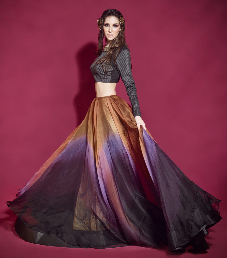 The heady designs are created from a colour palette of vibrant hues, enriched with delicate embellishments. Dramatic layers of sheer-on-solid fabric add to the mystique, creating an intoxicating synergy.