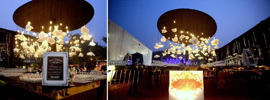 The décor set the tone to magic. Created to wow a guest list of 600 people, the design was elemental, whimsical and a bit crazy. At the entrance, an ‘Alice in Wonderland’ inspired installation of paper flowers towered over the guests in welcome. The lawns were covered in two canopies – one black, one white. Under the white canopy hung floral chandeliers and lounge seating. Under the black, a surreal dining set up was lit with hundreds of glowing white umbrellas suspended upside down amongst thousands of fairy lights glistening like stars in the night sky.