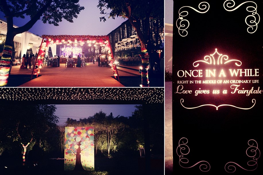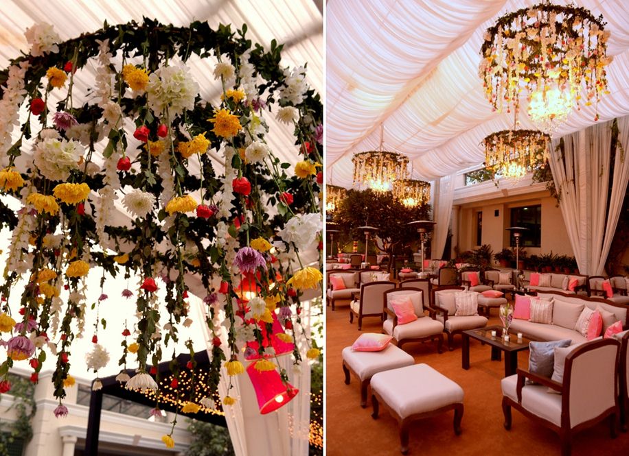 As backdrop to the bride’s mehndi ceremony, a wall was created out of fresh flowers while giant tea cups overflowing with roses and carnations were hung from a tree wrapped in fairy lights.