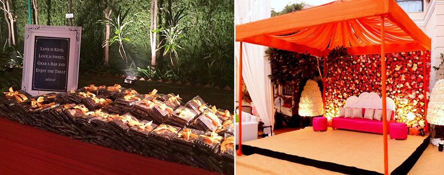 The island bar carried the wedding monogram and over-blown menus of the bride’s favourite cocktails. More whimsy followed with profusions of lycra flowers, Edison bulbs and iron cubes. The bar was further accessorized with shot towers, beer barrels, wine bottle holders and beer caddies. Further down, an elevated wooden hookah corner added a hint of decadence. By the wee hours of the morning the raised scaffolding constructed for the DJ had the bride’s brother and his friends rocking the show!