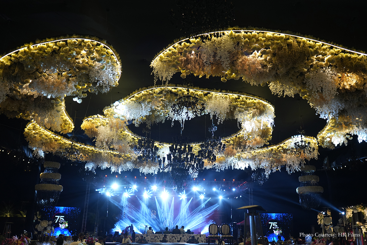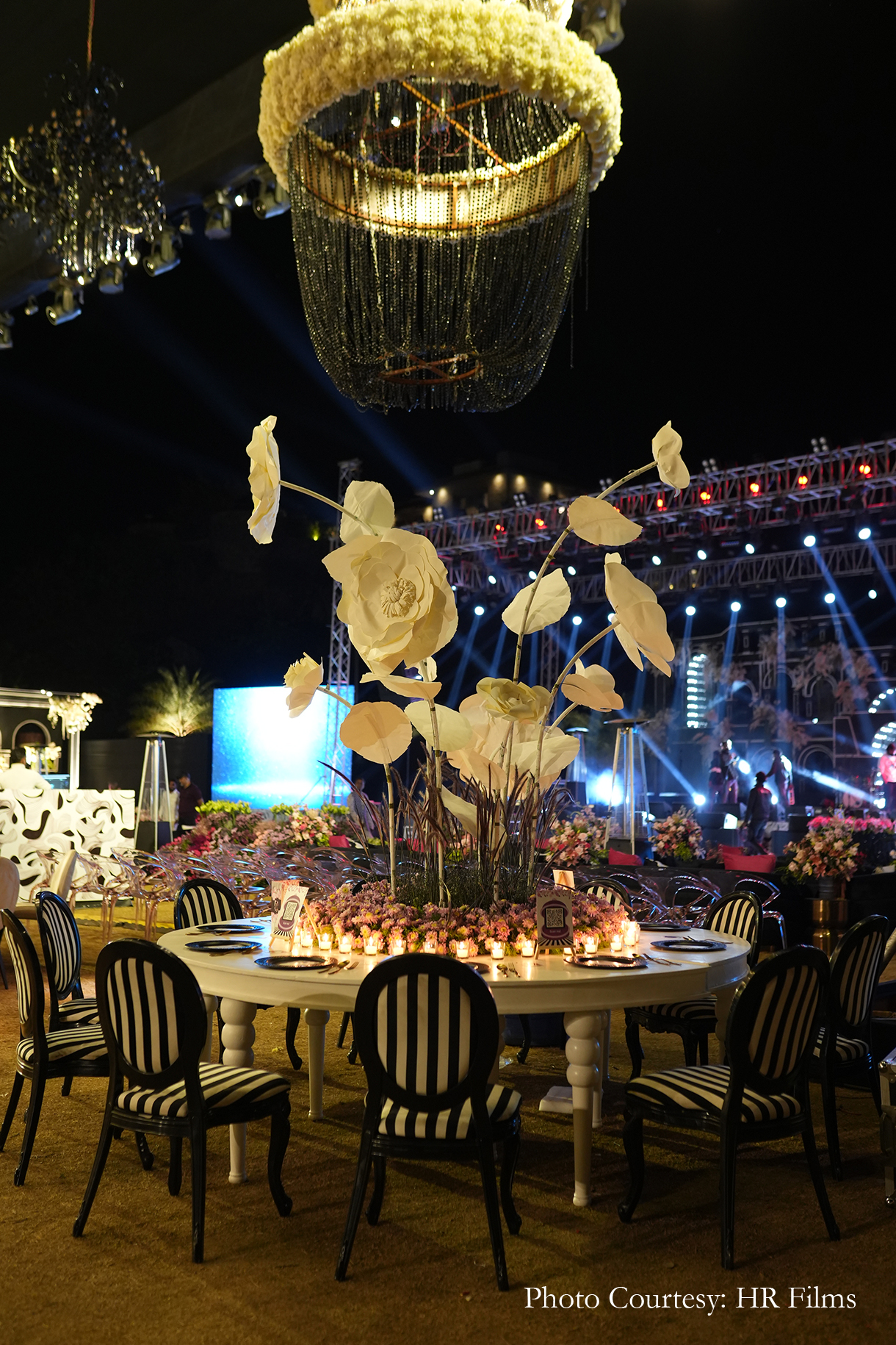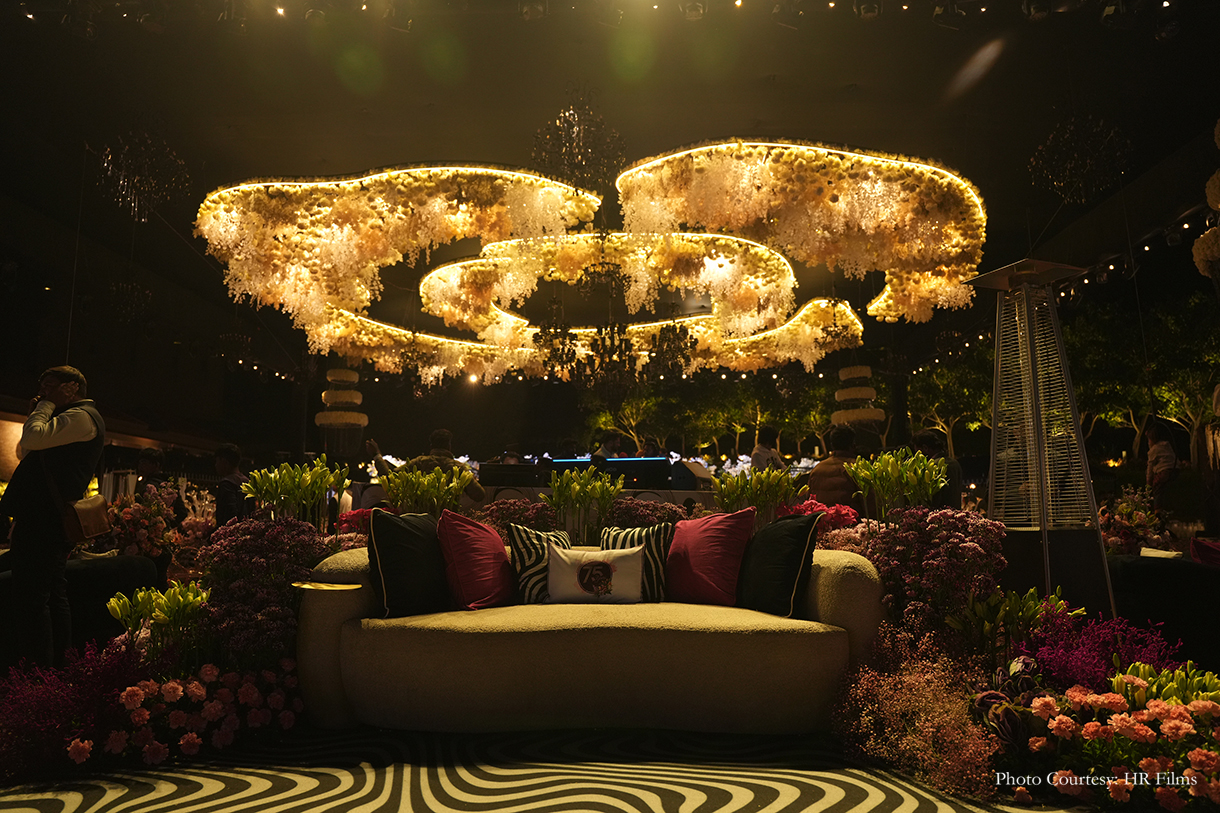 Purva shares, “The grand finale at the Frangipani Lawn was conceived as a night where heritage met modernity seamlessly. The vision was to create a setting so breathtaking that it felt almost surreal.” Guests arrived through an illuminated floral archway leading into a starlit alfresco banquet that blended contemporary sophistication with timeless grandeur. One of the most striking design elements was the ceiling installation—a breathtaking Rajnigandha chandelier that bathed the dining space in a soft, romantic glow.
