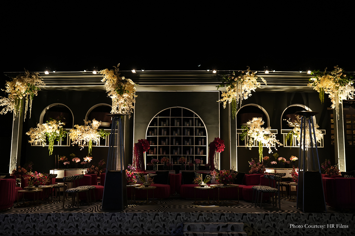 As twilight descended, the ballroom was transformed into an ethereal Mughal court, where rich maroon, antique gold, and classic ivory tones created an immersive experience filled with mystery and grandeur. A grand stage framed with ornate floral arches became the focal point, ensuring that the performances by Arman Thakur and Sagar Bhatia unfolded against a setting as mesmerizing as the music itself. Plush velvet lounges, intricately embroidered cushions, and cascading floral installations lent a dreamlike quality to the space.