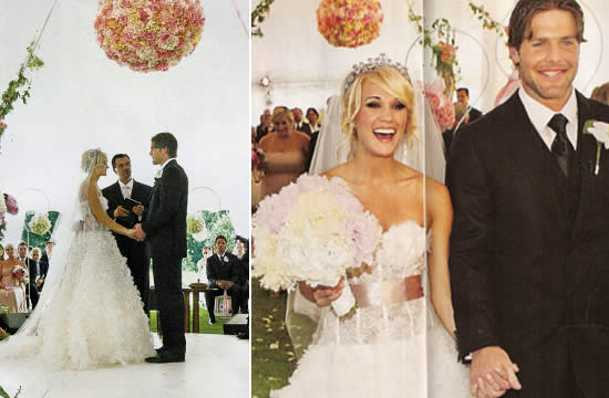 It was a Chantilly lace gown for the very pretty country music star Carrie Underwood who married NHL hockey player Mike Fisher at the Ritz-Carlton Lodge, Reynolds Plantation in Georgia. The former “American Idol” winner wore an elegant custom-made Chantilly lace and silk-organza wedding dress by Monique Lhuillier with a silver 40 carat diamond tiara.