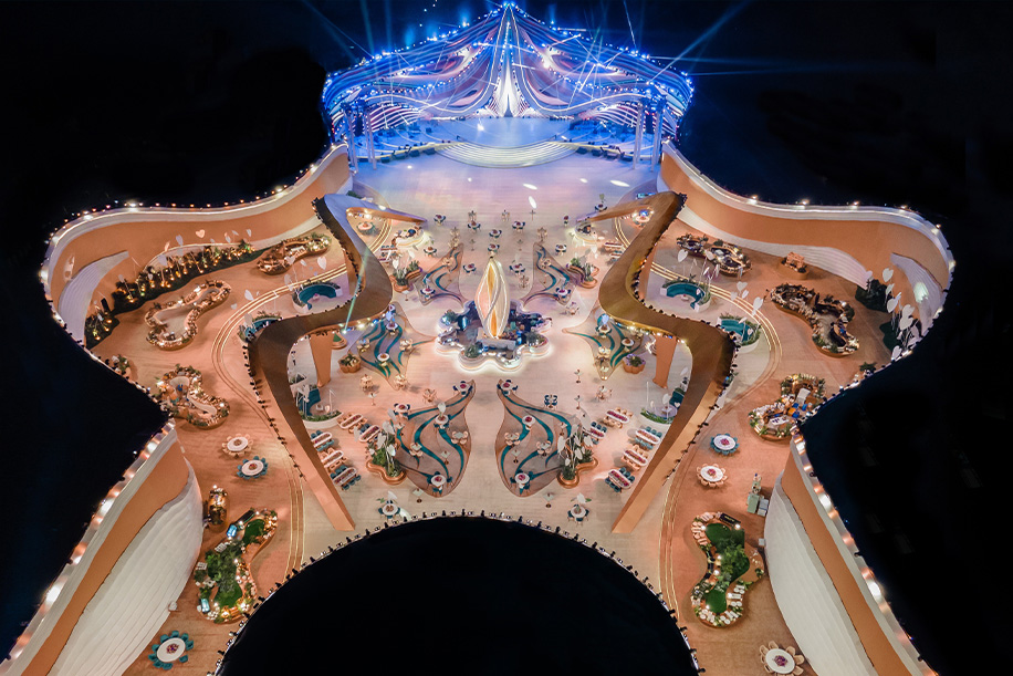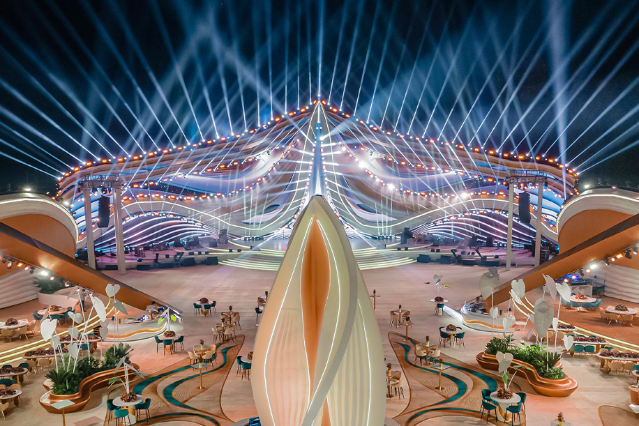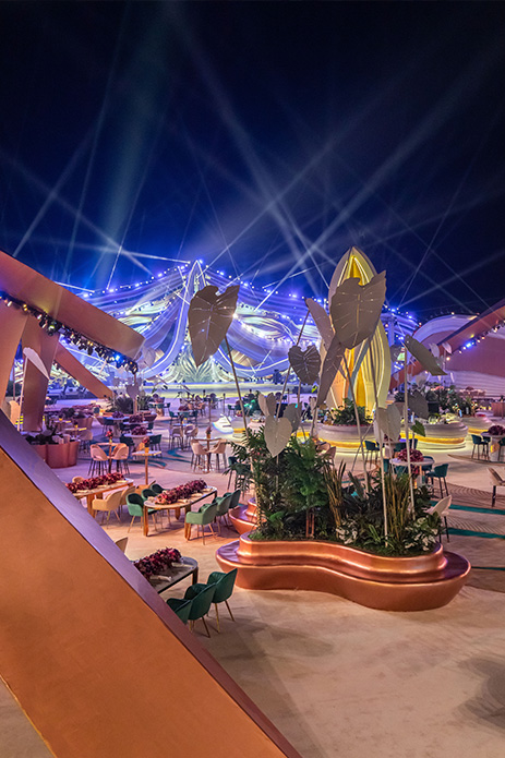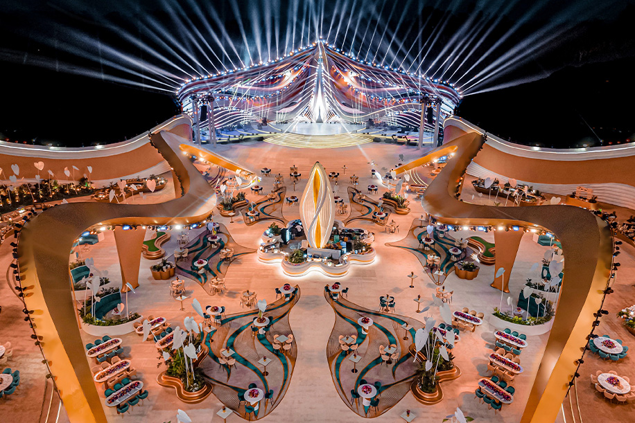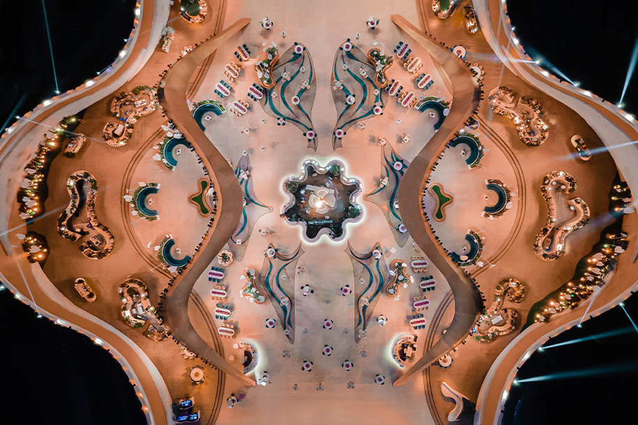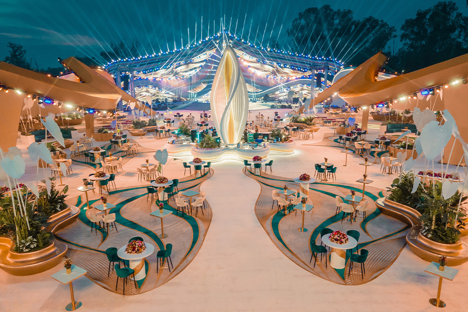 Spanning 122,000 sq ft this reception event venue transported the guests to a new world brimming with artistic flair. Aptly named ‘Land Art’ this event was an ode towards an architecture that respects the past but also looks eagerly towards the future. One of the first elements to inspire awe was the entryway that gave the guests a glimpse of what lay ahead. Mohamad Gayad from Le Mariage shares, “Creating the iconic yet dramatic main stage was an extensive and challenging process. Designed and produced by multiple curved physical and digital structures it took up most of the background space by going 8 floors up which is equivalent to 26 meters. Our aim was to meld a futuristic approach with urbanism and the volume of the outline façades and their dynamic synergy fit the vision perfectly. The integration of lighting fixtures was also key as it would add to the grandeur of the ambience. Plus, its smooth motions would create a lightscape scene that conveyed an inviting, theatrical, and dynamic vibe. Synchronization of all the elements was absolutely crucial here. Right from the lights, and the sound effects to the visuals – everything had to mirror each other to make the viewers feel like they’ve stepped into the future.