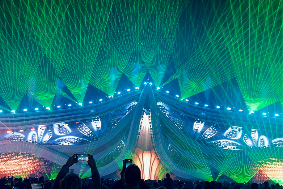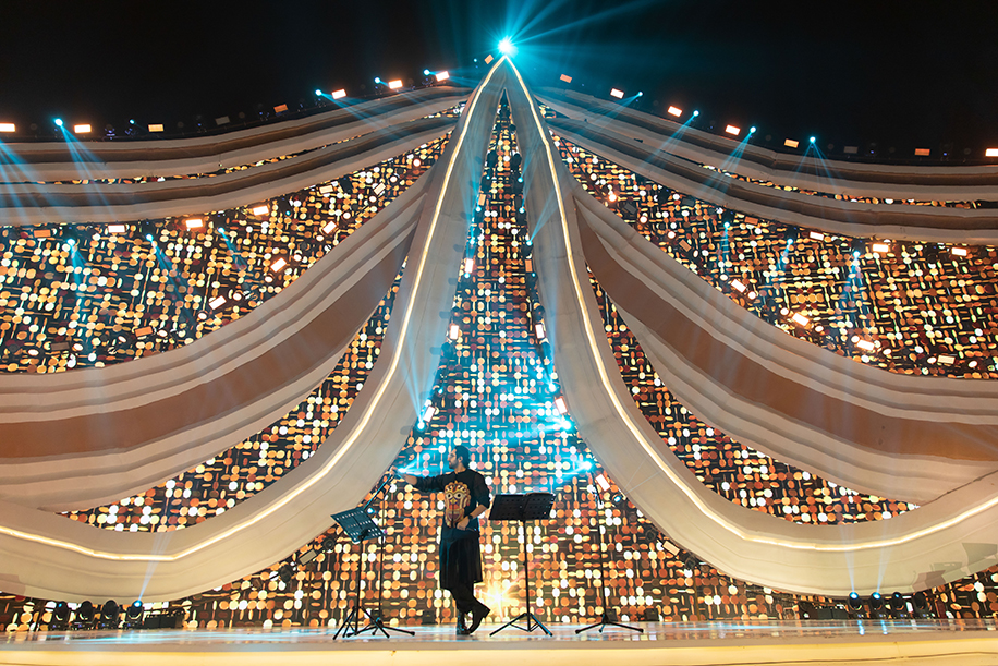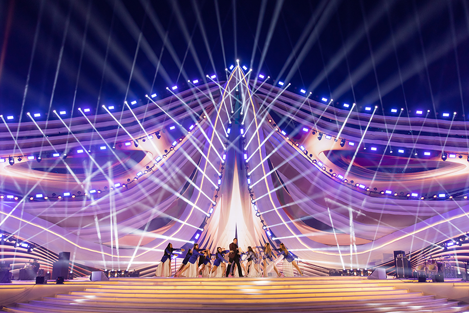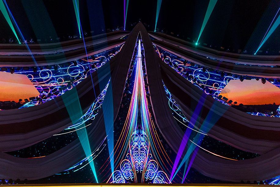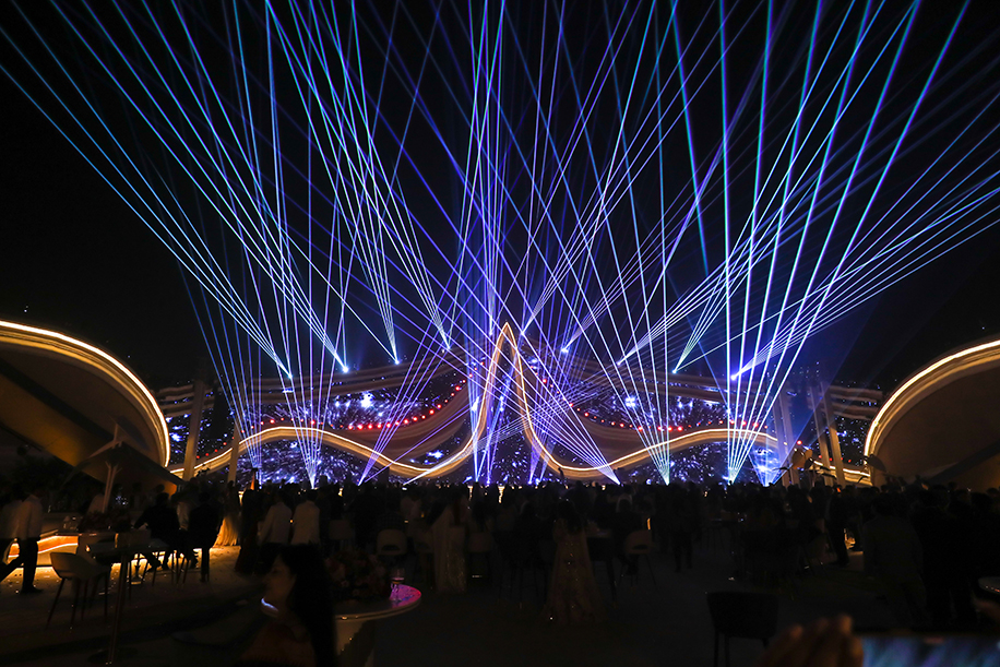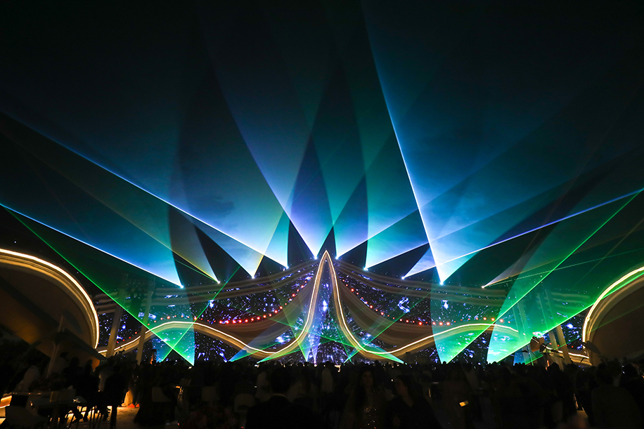 Spanning 122,000 sq ft this reception event venue transported the guests to a new world brimming with artistic flair. Aptly named ‘Land Art’ this event was an ode towards an architecture that respects the past but also looks eagerly towards the future. One of the first elements to inspire awe was the entryway that gave the guests a glimpse of what lay ahead. Mohamad Gayad from Le Mariage shares, “Creating the iconic yet dramatic main stage was an extensive and challenging process. Designed and produced by multiple curved physical and digital structures it took up most of the background space by going 8 floors up which is equivalent to 26 meters. Our aim was to meld a futuristic approach with urbanism and the volume of the outline façades and their dynamic synergy fit the vision perfectly. The integration of lighting fixtures was also key as it would add to the grandeur of the ambience. Plus, its smooth motions would create a lightscape scene that conveyed an inviting, theatrical, and dynamic vibe. Synchronization of all the elements was absolutely crucial here. Right from the lights, and the sound effects to the visuals – everything had to mirror each other to make the viewers feel like they’ve stepped into the future.