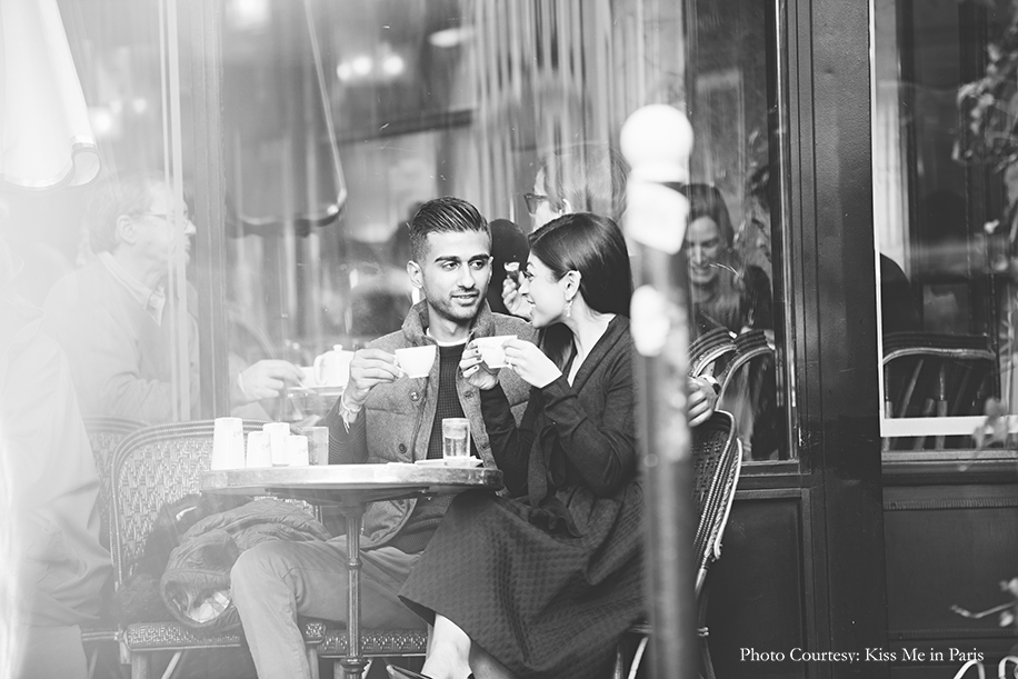 “On the day of the shoot, we had an early start. The idea was to avoid crowds in our photos and take advantage of the beautiful morning light and mist. While this was perfect from the photography perspective, it did get a tad bit uncomfortable because of the weather! Nimesh and I did not foresee it being cold and we were absolutely freezing! It took us an entire hour to warm up and look comfortable in our pictures. We also underestimated how long it would take to get from one location to another, so we did not have time to go back to the hotel to change to our second outfits. I ended up changing in the restrooms at Cafe de Flore and Nimesh changed behind a truck! I chuckle when I look back, but it was all part of the adventure.”