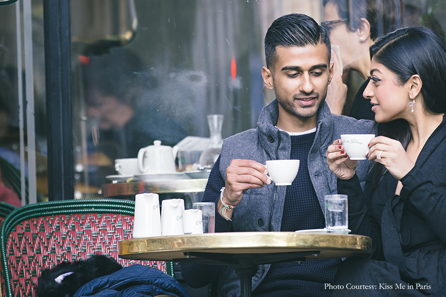 “We came back with a whole bunch of beautiful images. My favorite picture is the one where we are sipping cafe au lait on the sidewalk outside Cafe de Flore. The iconic Cafe de Flore sign features with lush greenery hanging over it and a pop of color from the red flowers. In this photo, Nimesh and I were just chatting and sipping our coffee, while Cengiz was snapping away from behind a truck across the street, creating a very candid and natural image. I love being in front of the camera but Nimesh is quite the opposite. However, our photographer was instrumental in making us both comfortable and directing us so that our chemistry shone through. I don’t think we were easy subjects at first, but we quickly warmed up to it! What worked for us was taking pictures that were more candid than posed and formal.”