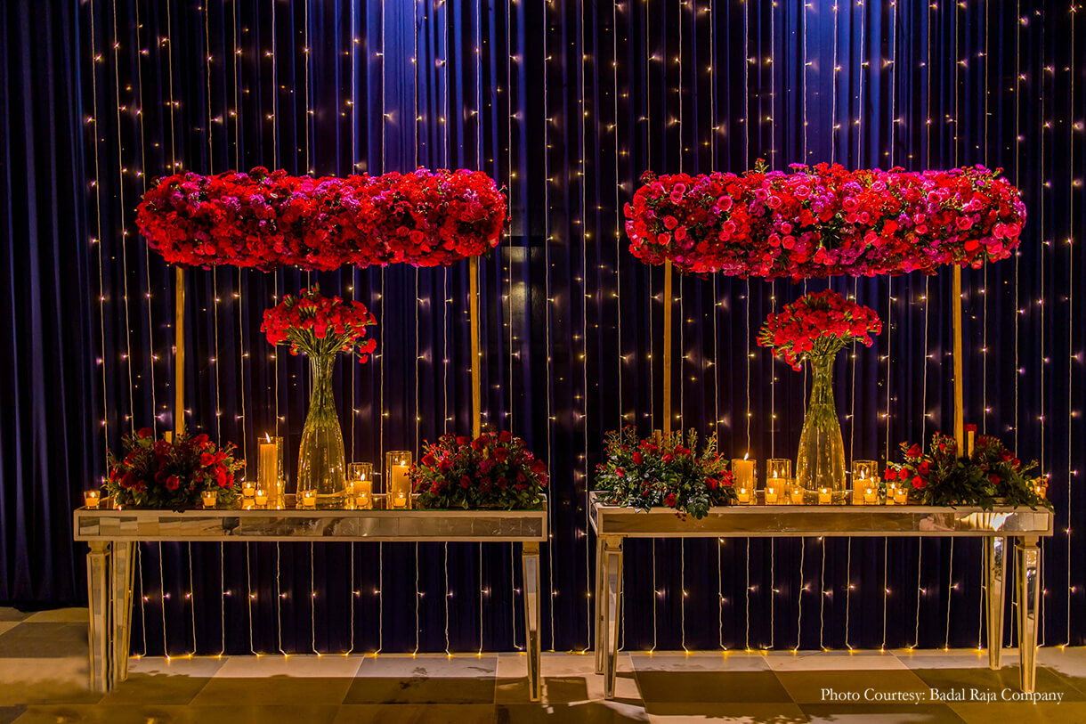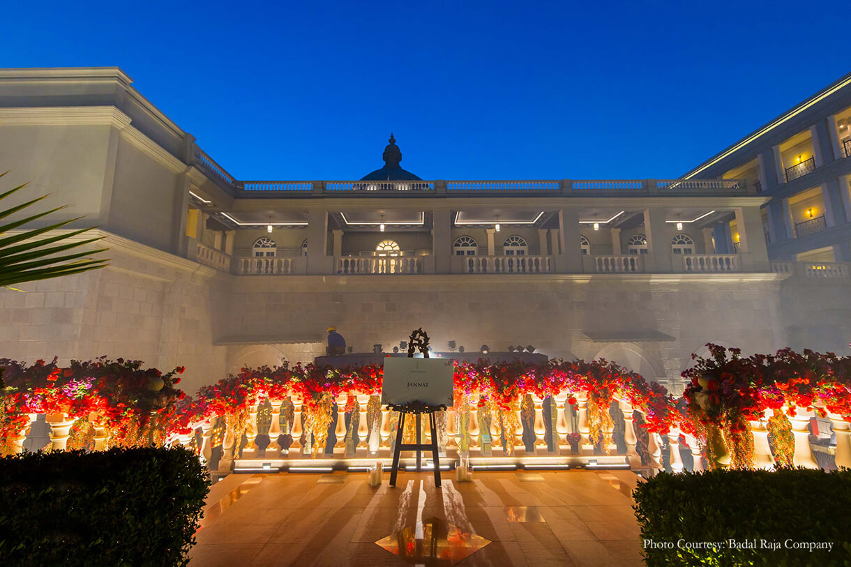 Chetan shares, “On the first evening, the cocktail party and tikka ceremony merged as one. This evening was named ‘jannat’ as an ode to the feeling of being in heaven when you are in love. A song by the same name was sung by Harshdeep Kaur. The decor was very floral heavy with guests entering via a stairway laden with flowers, and entering the ballroom to find large floral installations, a bar and a stage that would lend itself to many performances through the evening.”