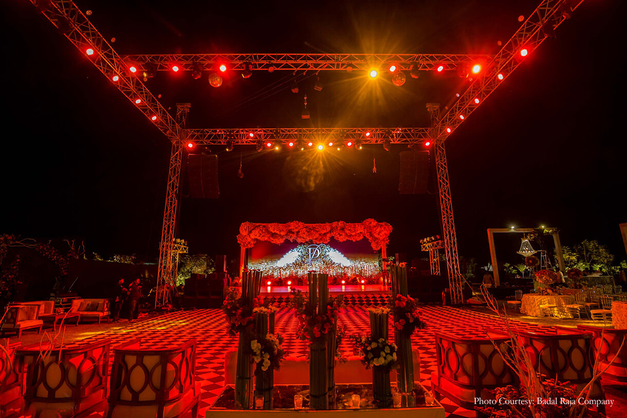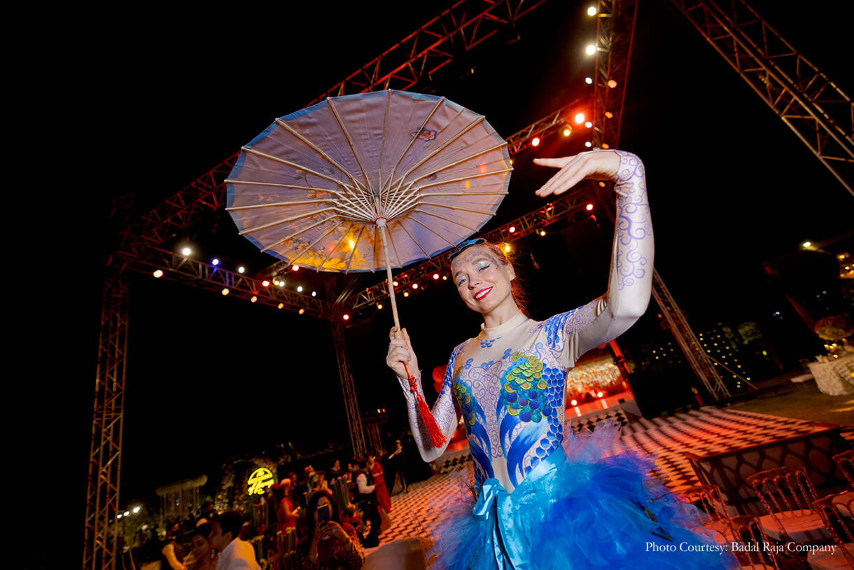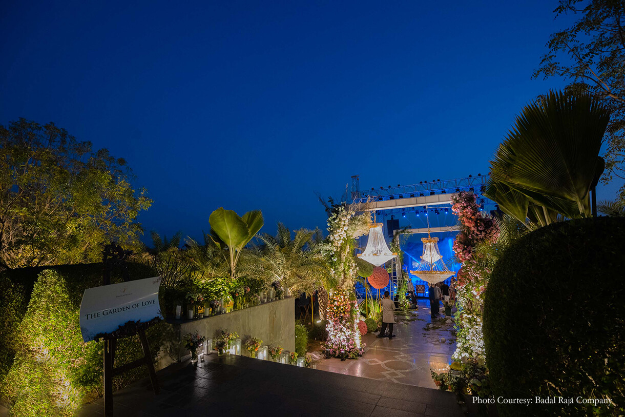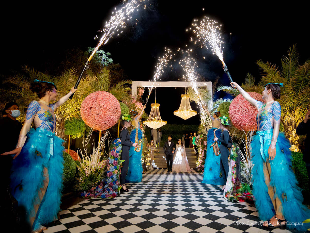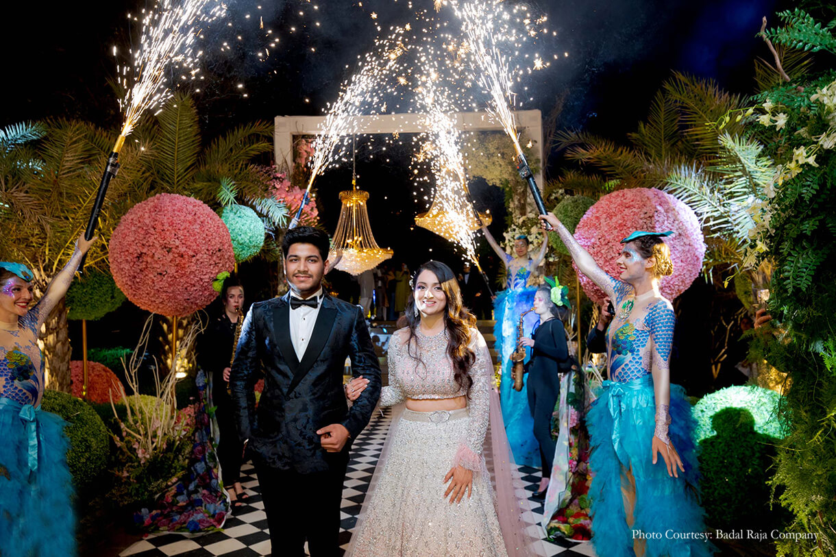 For the ‘Garden of Love’ themed engagement, everything just had to be perfect! Chetan shares, “As the sun set, the guests walked onto the main lawn of the hotel to find a visual spectacle! A walkway led the guests into a central arena with trussing and lighting that replicated a concert seating on three sides. As the sky darkened, the lights came on and the music changed. The ‘Garden of Love’ started coming to life. Performers dressed as large birds, models on stilts with floral dresses, magicians and acrobats adorned the area, welcoming, interacting and entertaining the guests. A display of fireworks welcomed the couple as they walked in and were seated. Following this was a 45-minute musical inspired by the Cirque Du Soleil, a depiction of Pavni and Pranav and their love story.”