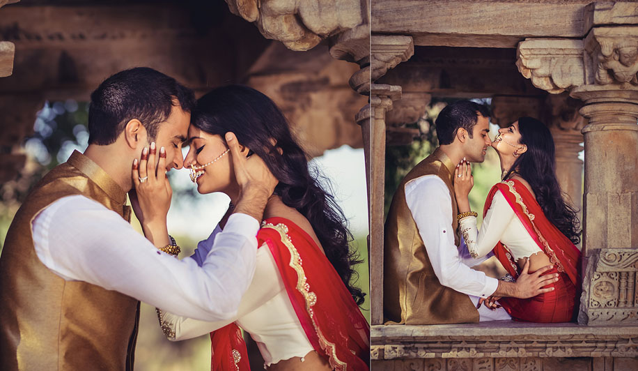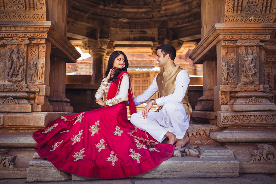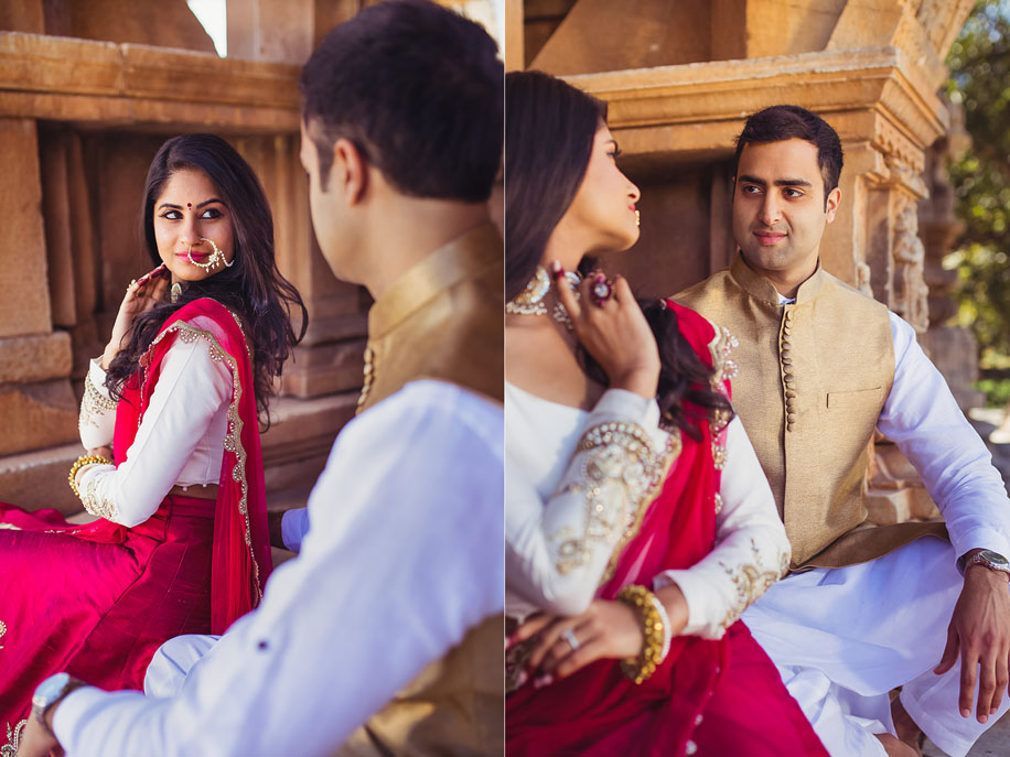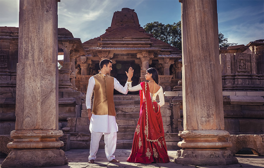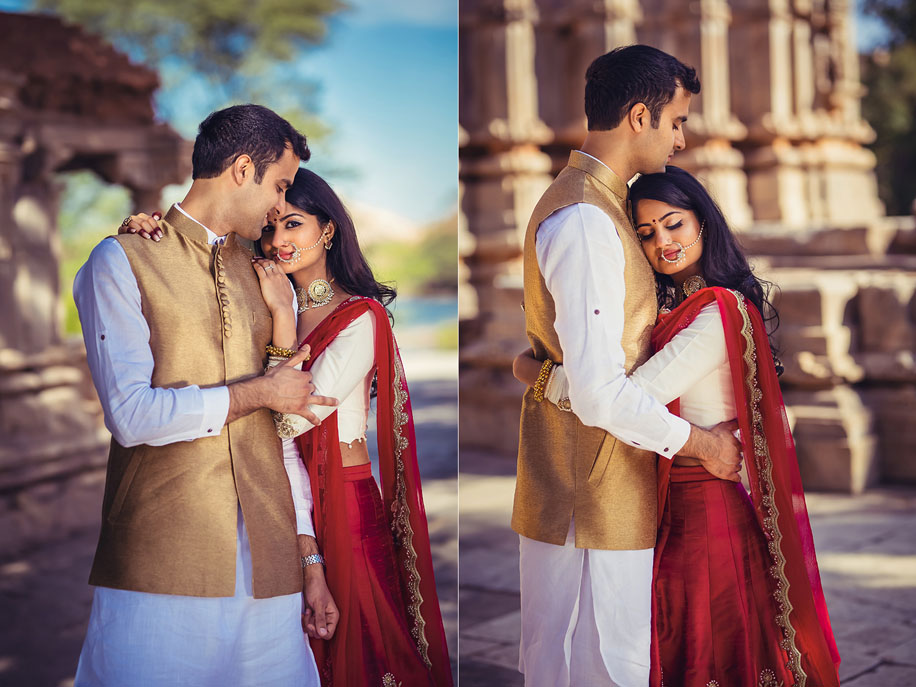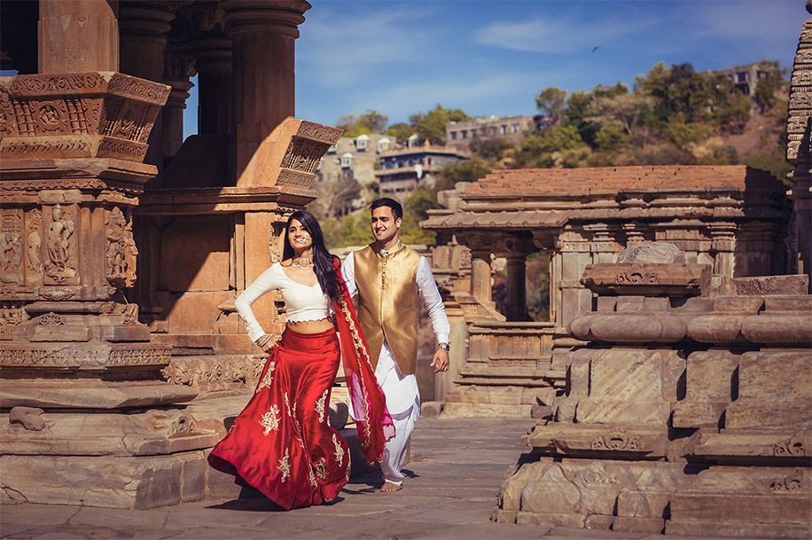“Though I grew up outside of India, my upbringing has instilled pride and passion for our Indian heritage – especially its art. Some of my favorite childhood memories involve Indian art – dancing through four-hour Bharatnatyam classes, collecting every Bollywood cassette tape possible, listening to live carnatic music during Margali Masam in Chennai, visiting our ancestral sites at Mahabalipuram and Nuggehalli – these experiences always transported me to a different place and time, to a faraway yet familiar dream. I wanted our pre-wedding shoot to capture that timeless dream that is traditional India, its classical arts and architecture – and return to a time more simple, spiritual and serene and this 10th-century temple in Udaipur was just perfect.”