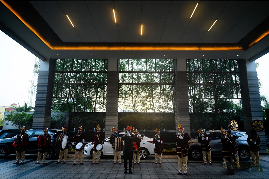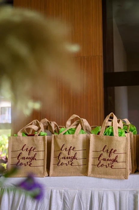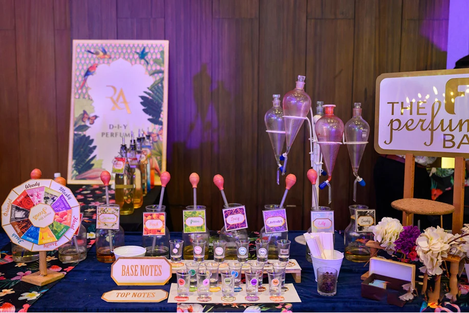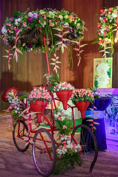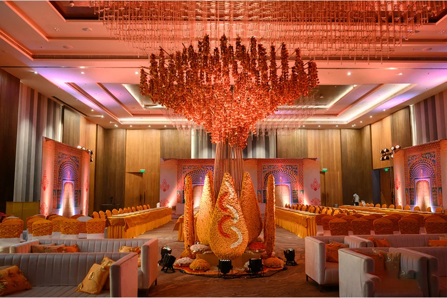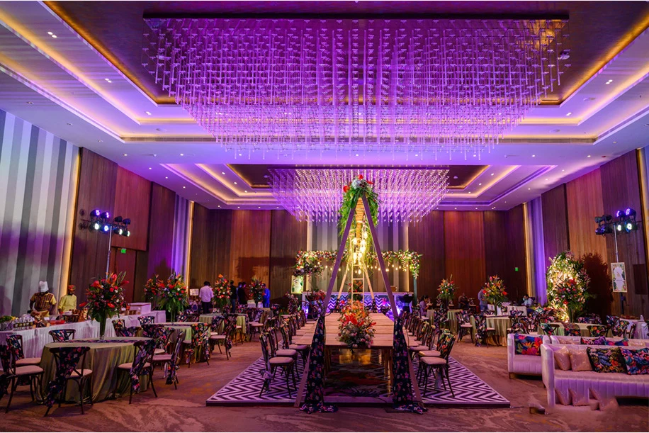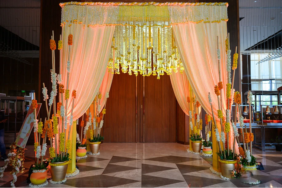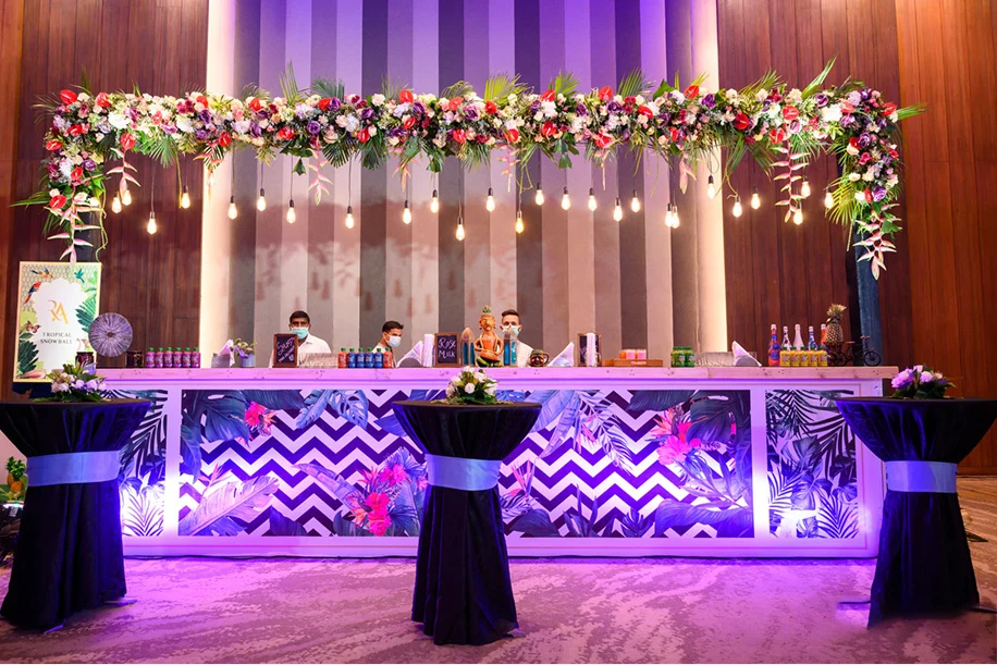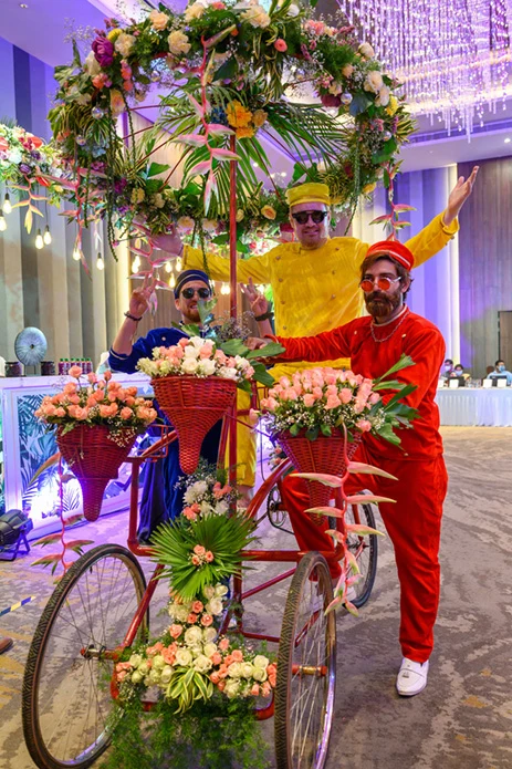For the second day, the couple got their families and loved ones together for a tropical lunch. Himanshu shares, “The entire ballroom was given a makeover with highly detailed decor. A gaming corner with tropical-themed games kept the guests busy and they were each also given a luxurious tropical basket. Live musicians enthralled everyone with their groovy tunes.”