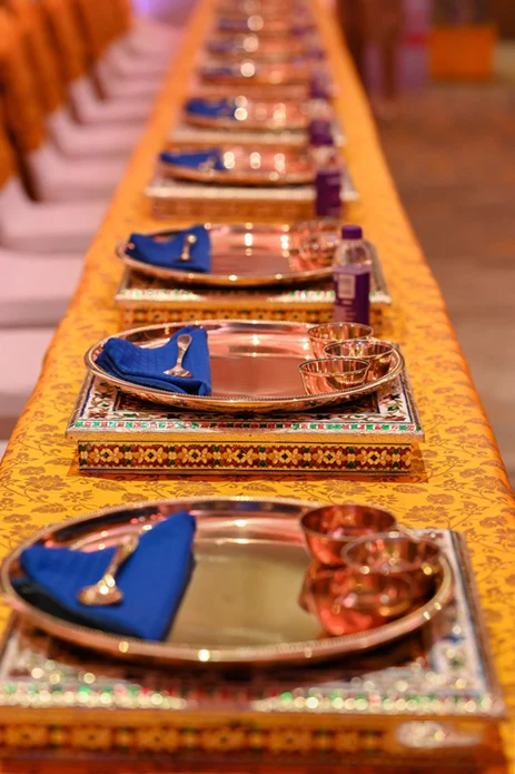 Sajan Goth is a Marwari tradition where the families come together to enjoy a lavish meal together. For Rahul and Aakruthi, the team took a cue from the rich Rajasthani culture. Himanshu Kothari from Weddingz by Mindz shares, “The Sajan Goth function is inspired from age-old traditions which we wanted to give a classic touch to. Decorated with Rajasthani elements dotted with the live counters like block-printing of dupattas, live bangle stall and pottery, the artisans for the same were specially flown in from Jaipur. These activities kept the guests engaged while they helped themselves to mouth-watering Rajasthani delicacies. Plus, a live band enchanted the guests with a mix of Bollywood and Rajasthani songs while the couple was welcomed by folk dancers.”