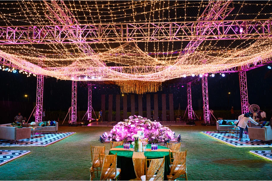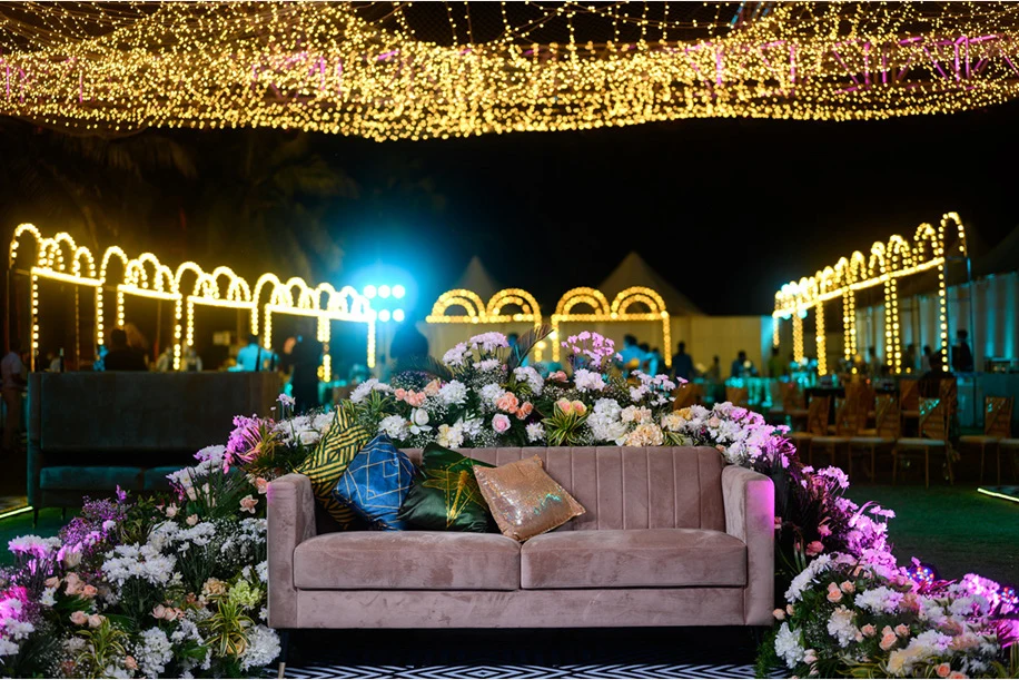 Hosted by the beach under the stars, the Sangeet was ultra-glamorous and extravagant. Akansh shares, “The Sangeet was hosted on the lush lawns by the beach and welcomed guests with a grand tunnel that was crafted out of fairy lights. Keeping the safety protocols in place, sanitizers were kept at the entrance and at every other corner of the venue. As the guests walked in, they were greeted by a slew of paparazzi to make them feel like celebrities. Beautifully decorated food counters, comfy lounge seating and the colossal stage set everyone in the mood to party the night away. For the couple’s entrance, a pathway was lit up by almost 100 cold pyros. Later on, everyone moved to an indoor space for the after-party where a DJ ensured everyone grooved till the late hours!”