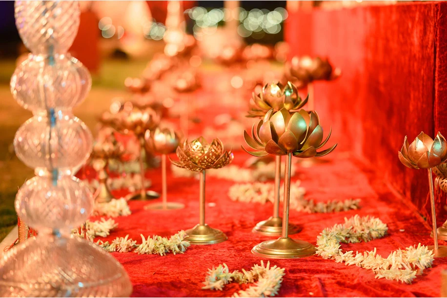 The Wedding décor looked surreal, with a stunning entryway that had a mirror studded elephant at the entrance along with a small yet perfect Sheesh Mahal-inspired stage for the couple to click some photos during the meet and greet post the Varmala. The Phere followed Jain traditions and was a midnight affair with a Sheesh Mahal-themed floating mandap surrounded by floating petals and candles. The guests were given bells to ring during the Phere and a skilled solo flautist performed for the guest during the rituals.”