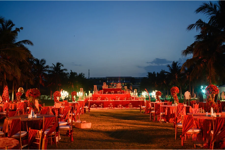 Akansh Jain from Weddingz by Mindz shares, “Both, the couple and their families were keen on enjoying a grand wedding. Although we had to shift venues multiple times owing to the pandemic, we evaluated Rajasthan and Bangalore due to the pandemic, but then we were finally able to find our perfect venue in Chennai! This wedding was planned with utmost detail and security as we had tried to create a small bio-bubble. Our team and the couple were very keen on keeping the wedding safe and we tested every person who entered the resort. The entire event team and the staff wore a face shield and mask throughout the wedding keeping the guests and their own safety in mind.”