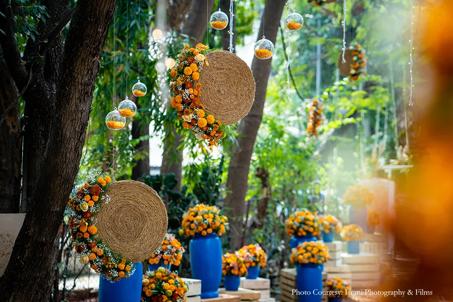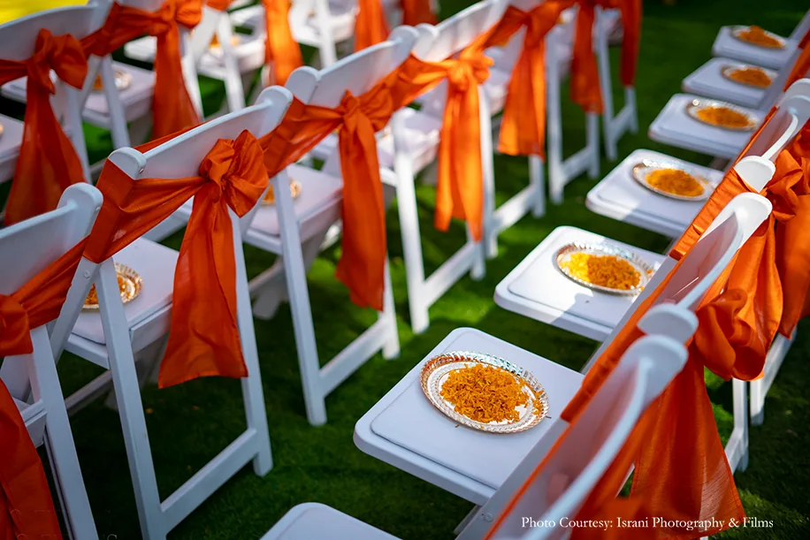 “For the next day, we created a traditional vibe since the guest list included many elders and there were several rituals to be held. Keeping this in mind, we removed the blue from the day before and added yellow into the mix with orange. Bells were also a part of the decor along with pickle jars accentuated by floral arrangements. Also, we created a comfy seating area with custom-printed takhats. Since multiple dance performances were also on the cards, a simple backdrop along with a raised platform gave everyone ample space to show off their moves.”