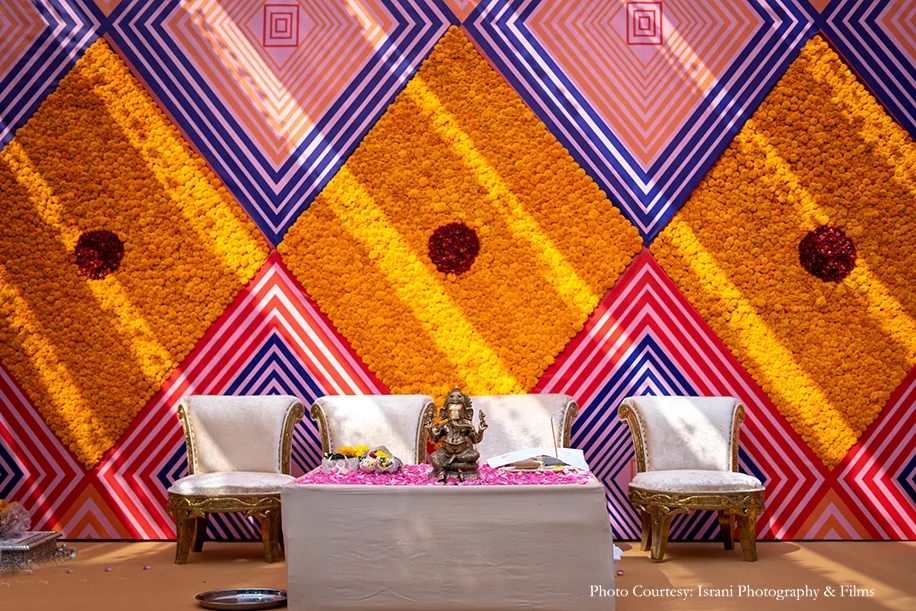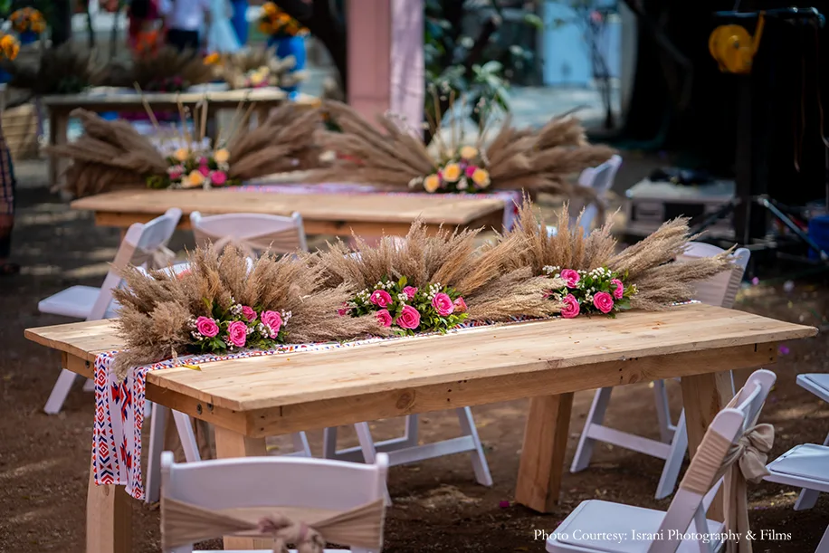 For day one, we went with the Boho theme mixed with Aztec prints. A color palette of orange and blue brightened up the venue while elements crafted out of jute suspended from the trees exuded an earthy vibe. Ria’s Mehndi backdrop was a gorgeous tree that we decorated with flowers for her to sit under. Also, her Ganesh pooja backdrop was SH Raza-inspired. The tables had bohemian centerpieces and Aztec print fabric runners.”