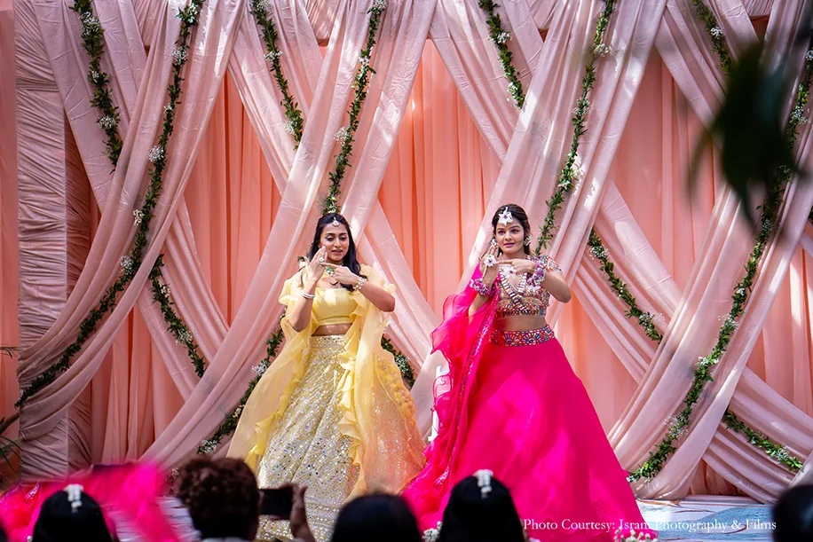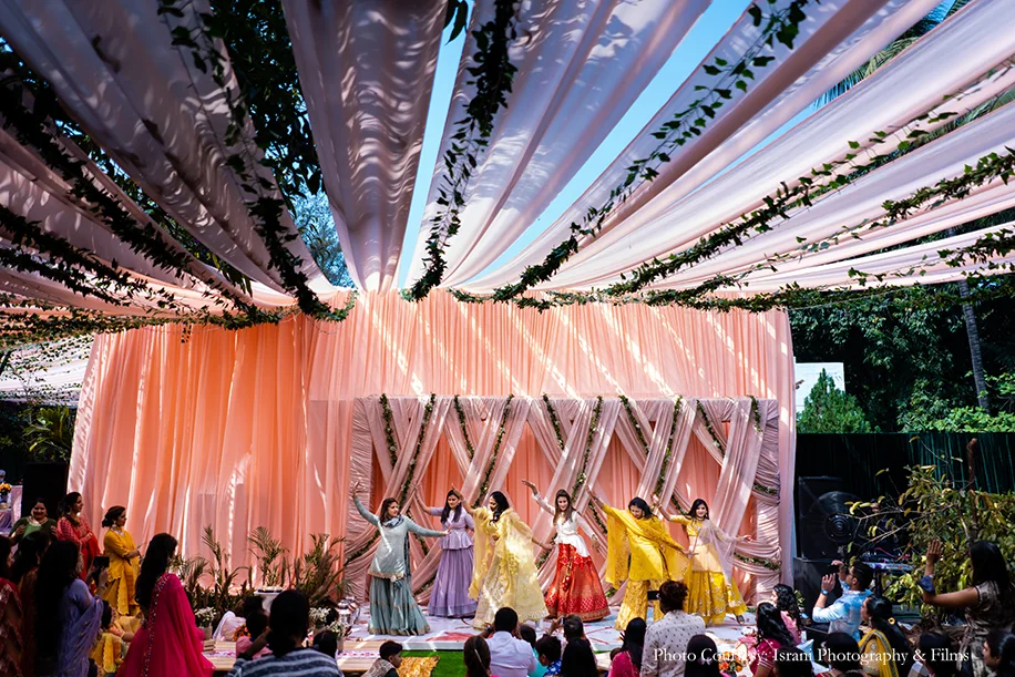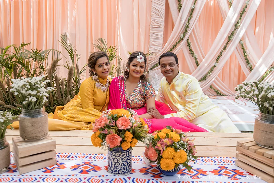 Swathed in striking hues and dotted with elements that uplifted everyone’s spirits, Ria Jain and Parth’s home-based pre-wedding celebrations under the pleasant February sun were enchanting. Skillfully planned, designed and decorated by WeddingSutra Favorite – Q Events and Weddings who used their creativity to the fullest, this celebration took the cake when it came to experimenting with catchy color combinations!