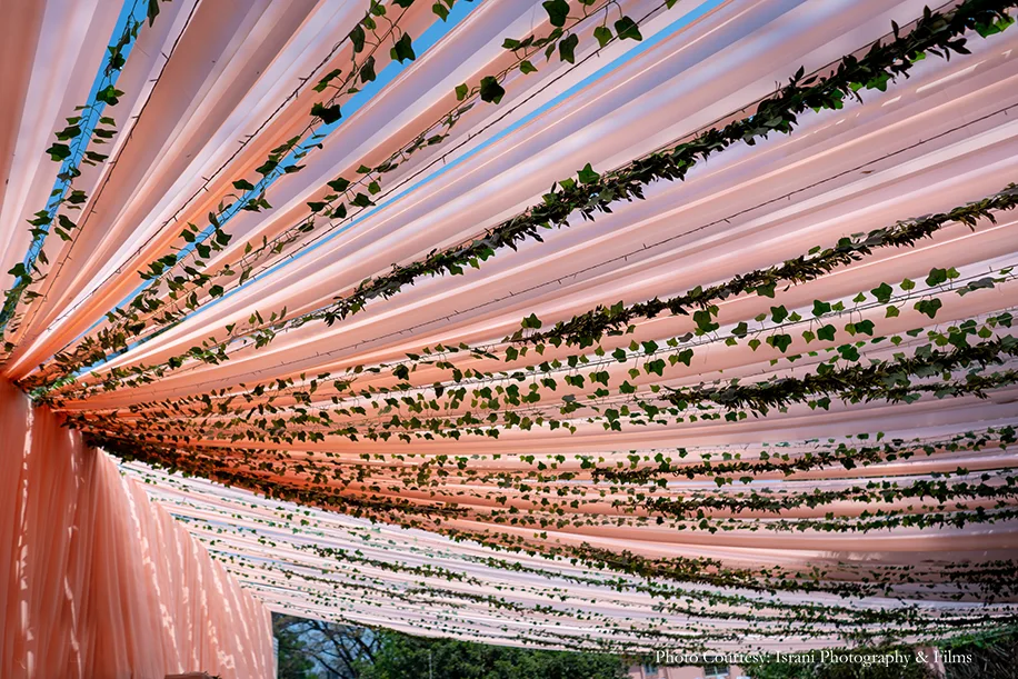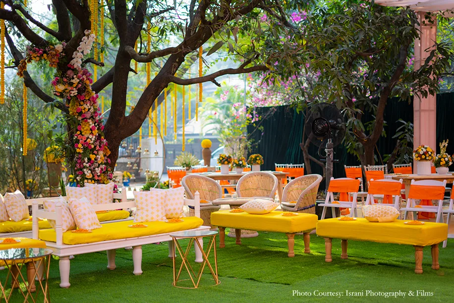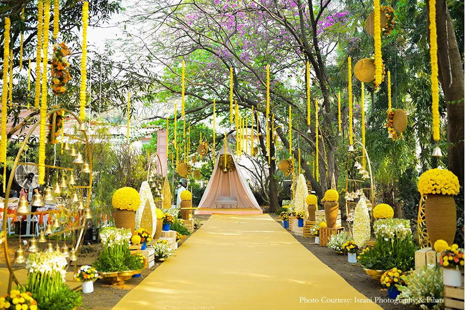 Consisting of a bridal Mehndi ceremony, Haldi and a Ganesh puja, the celebration was hosted at the family’s old home in Pune which was also a challenge that the planning team took in its stride. Damini shares, “Working around the venue was quite a task as the bungalow hadn’t been lived in for quite a few years. But on the flip side, we had vast grounds that got plenty of sunlight. As we worked against the deadline and within a budget, our experimentation paid off as we made multiple uses of decor elements for both days. We masked the facade of the bungalow with drapes and created a canopy with natural green elements. We also added green turf for it to all come together and look like the garden of the bungalow.