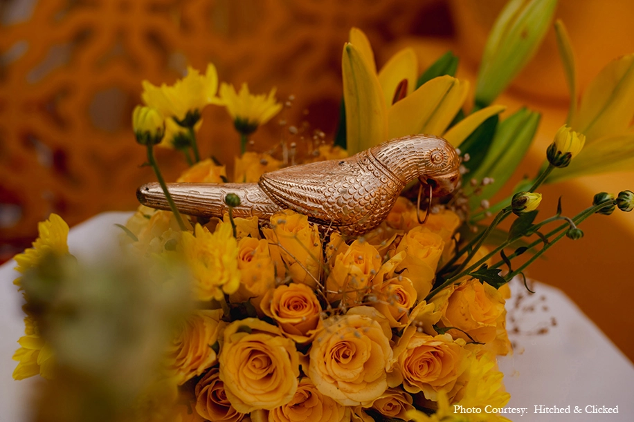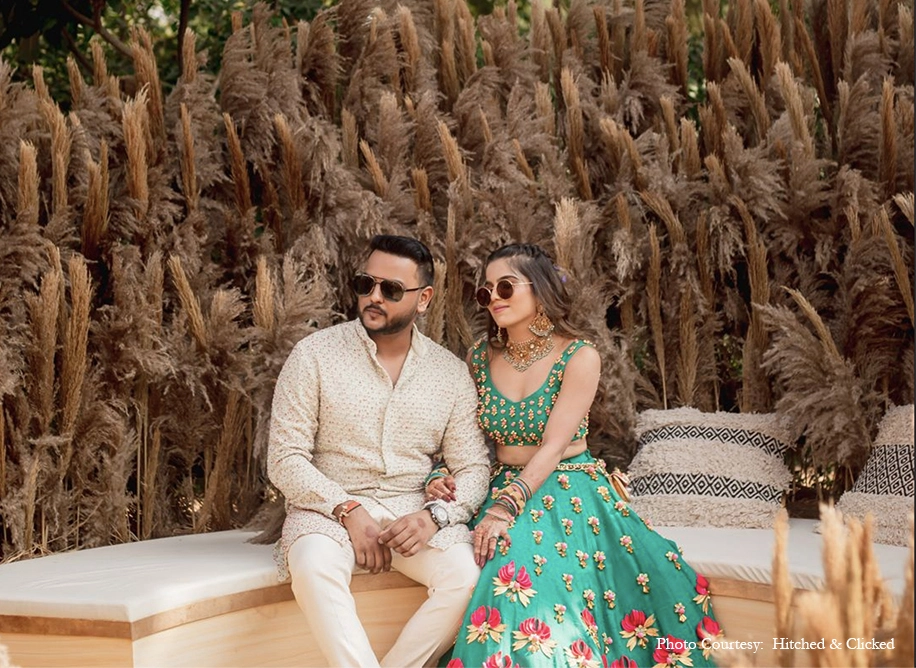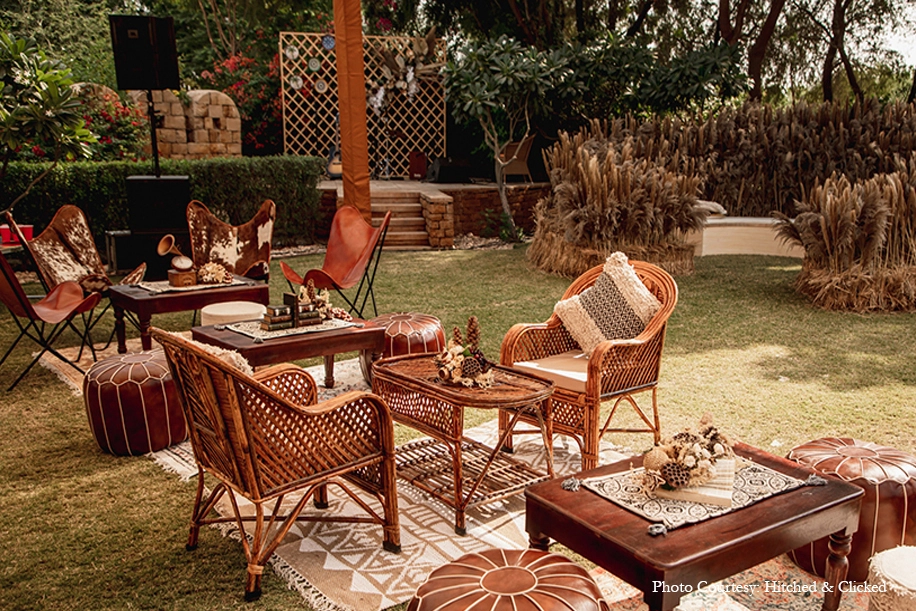 Hosted at Suryagarh’s Champa Garden, the Mehndi decor borrowed from the earthiness of the space. Decorated with a mix of vintage and rustic elements, the occasion exuded old-world charm. Peacock chairs, Moroccan poufs, rattan chairs, leather director chairs and plush sofas recreated the aura of an old hunting lounge, replete with antique paraphernalia such as telephones, keys and books. Classy arrangements of pampas grass, dry flowers and shola flowers brought from West Bengal added a touch of bohemian allure. The hidden semi-circular couple-seating surrounded by a wild, mystical arrangement of pampas grass stole the show.