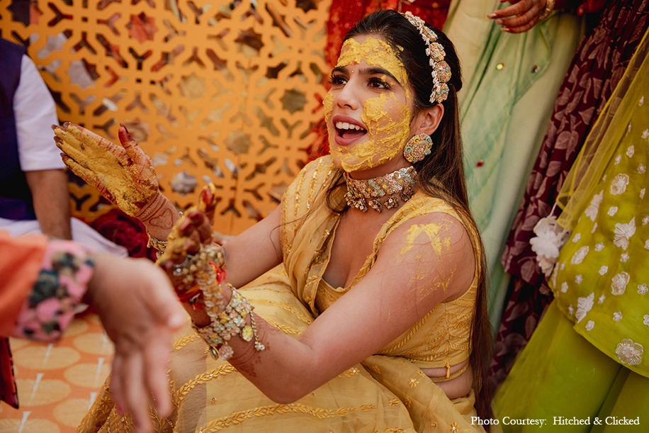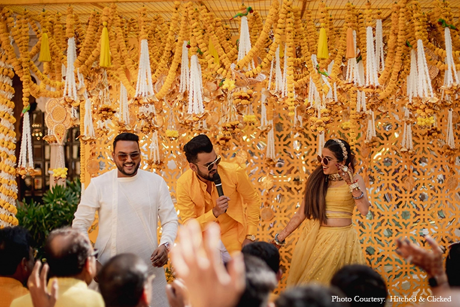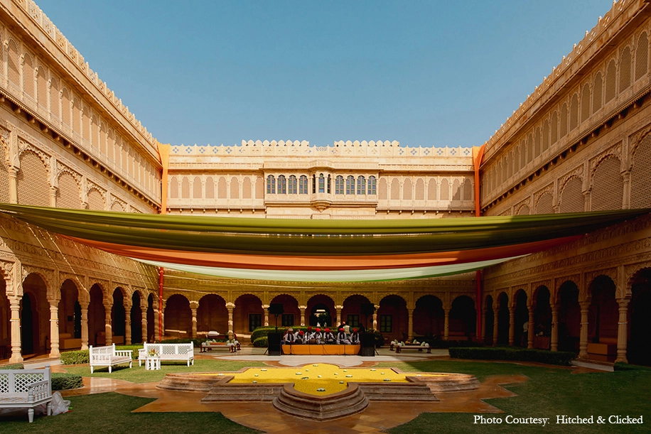 The central courtyard was bathed in splashes of citrus hues for the Haldi function. Sunlight rippled through the draped canopy of mustard and green over the space decked in an abundance of marigolds, including the pond in the middle. Cushions and furnishings printed with palace-inspired motifs elevated the classic white furniture, while gold ghungroo, tassels and other elements added a touch of royalty to the floral arrangements.