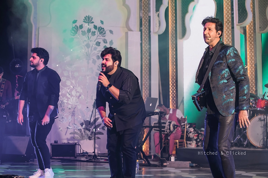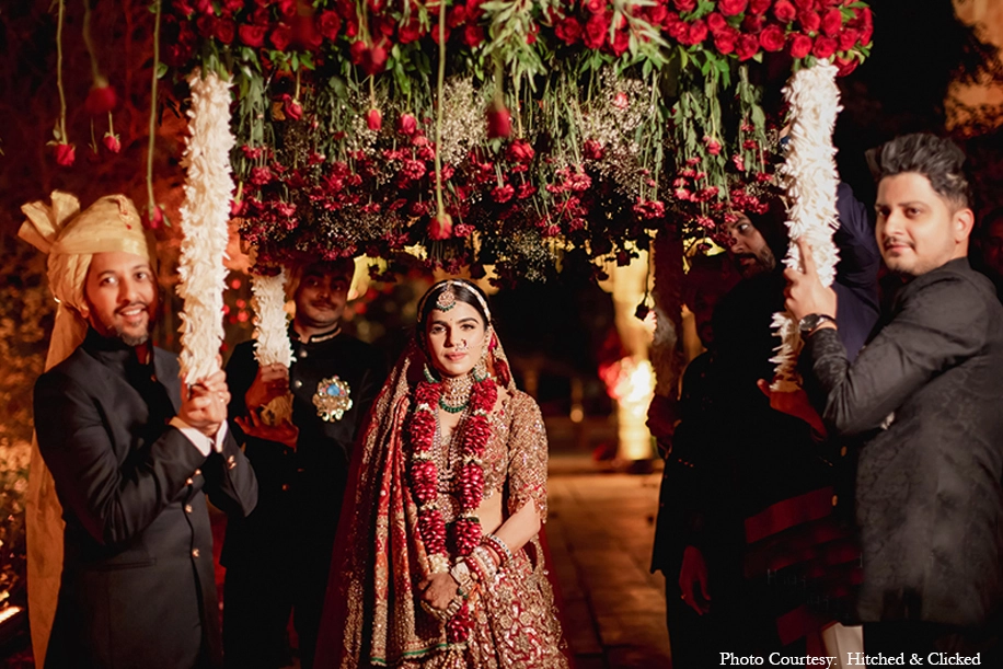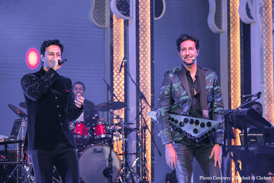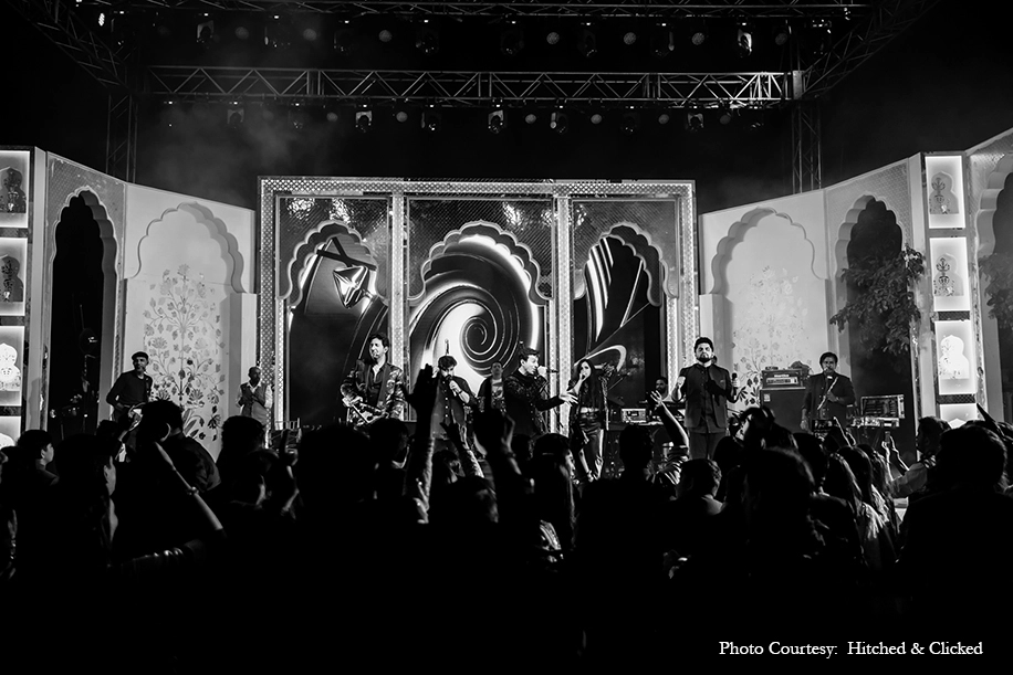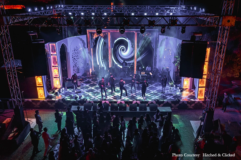 The glitz and glam of the Sangeet night were adorned with the musical stylings of the hit-duo Salim-Sulaiman and decor inspired by the bride’s love for Sheesh Mahal. A magnificent stage shaped with jharokhas and palatial engravings surrounded the grand stage that also saw rousing dance performances by the couple and their loved ones.
