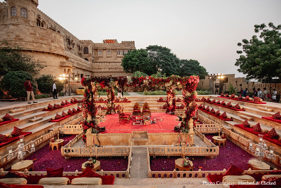 Spanning a vintage boho-inspired theme for the Mehndi to an island mandap and Wedding crafted sumptuously with red roses, the decor for every function borrowed elements and ideas from the venue itself while accentuating the vibe and feel of the space with great panache. Design HQ thoughtfully designed and produced every occasion to ensure a cozy, intimate feel while channeling the grandeur of the iconic palace hotel. Watch it all unfold below.