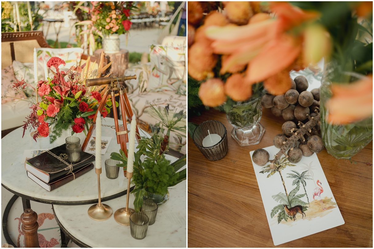 Guests were made to feel like explorers on a curated journey. Interactive zones, unexpected décor surprises, and thoughtfully layered spaces brought a sense of discovery throughout the celebration. From the organically styled floral arrangements to the sculptural decor pieces, every detail felt like part of a larger safari narrative, which was intimate yet exuberant. Framed against the serene lake and open skies, the Mehndi took place on the verdant lawns of Suryagarh Palace. “There’s something magical about this space; it already felt grounded in nature and tradition, and we simply extended its story with our safari dream,” Aastha shares.