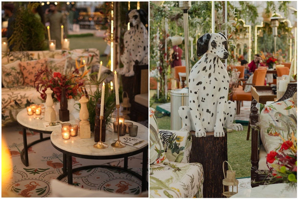 One of the bride’s most heartfelt requests was to include her beloved dogs in the celebration. This was honored by placing sculptural figures of the pups beside her seating area, making sure her furry companions were present in spirit at every turn. “It was a beautiful way to reflect her bond with them,” Aastha notes.