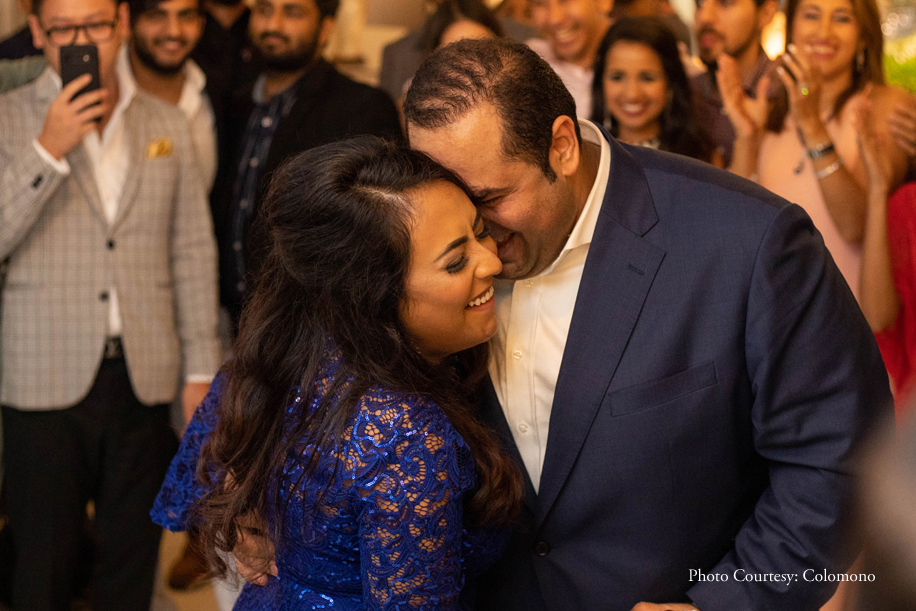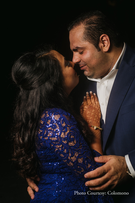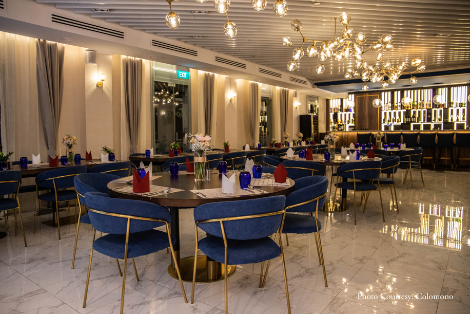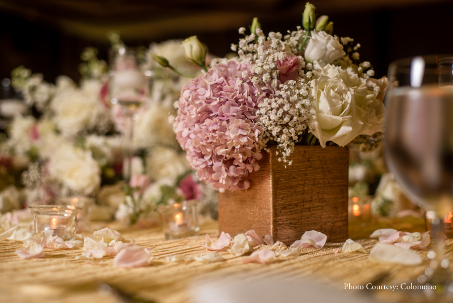 A contemporary welcome dinner at the Royal Taj, Singapore, marked the start of the celebrations. The chic spaces were dominated by a palette of blue and white with golden and deep brown accents. Satish shares, “Since the Amar Prith and Karan were looking for something that was very modern and clean, the Royal Taj made for a fitting venue for this function. Keeping in line with the aesthetics they wanted, we brought in white blooms that were placed in glass vases which made for pretty centerpieces.”