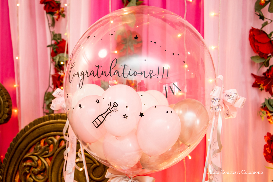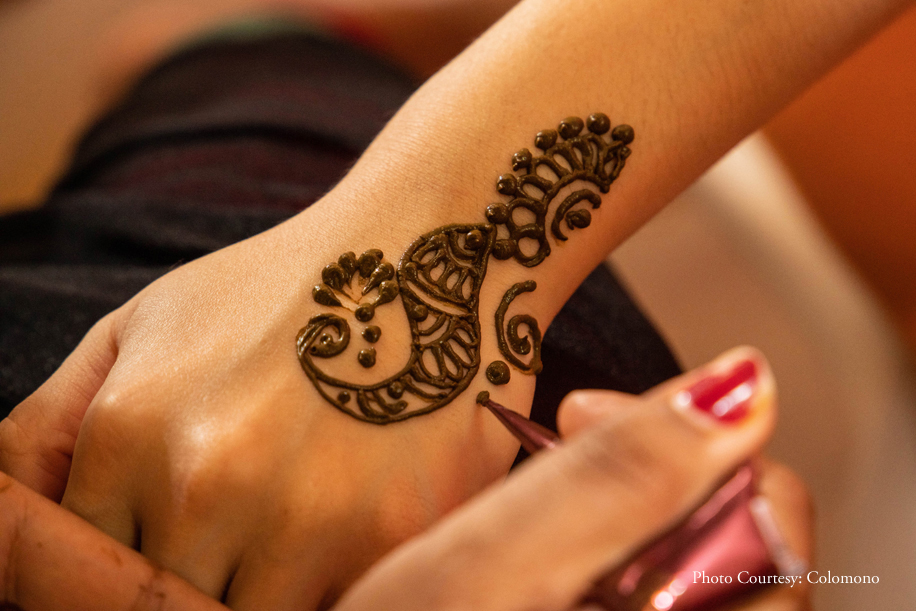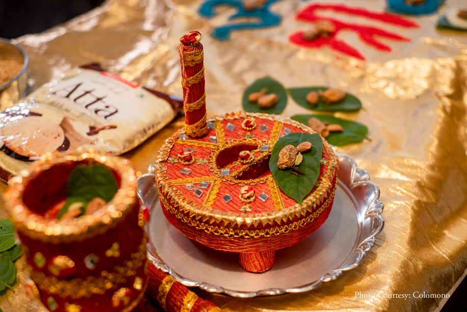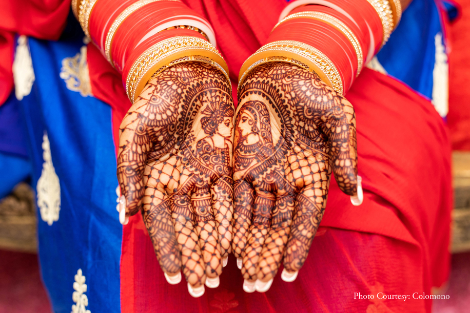 The mehndi ceremony took place the next morning at the bride’s house. An intimate affair, this function was attended only by the couple’s nearest and dearest. The highlight of the setup was the bridal seating that featured designs and bright colours that are synonymous to Indian celebrations. A wide seat with a back that featured intricately carved paisley motifs, the kind that is often seen as part of a mehndi design, made for the bridal seating. Pretty pink and white drapes were used to create the backdrop.