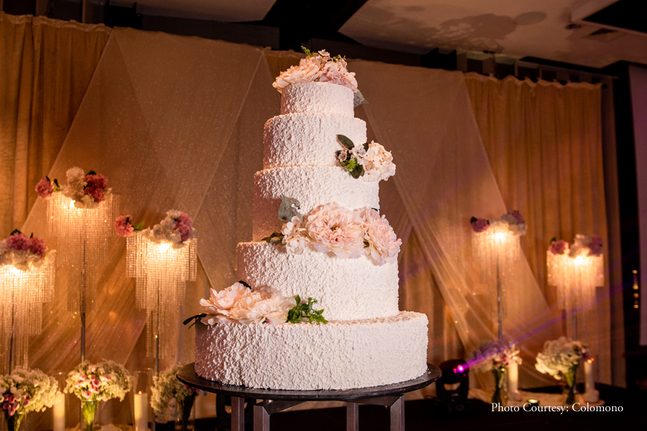 Their celebrations concluded with a grand reception at Fairmont Singapore. The decor followed a blush, white and golden color scheme, and each element added to the elegance of the setup. Shimmering drapes and sparkling chandeliers made for the backdrop for the cake-cutting ceremony. The five-tiered cake was crafted to match the decor design and was decorated using pastel flowers similar to those used as the centerpiece. In the center of the ballroom was a white dance floor, and the couple’s first dance was followed by performances by their friends and family.