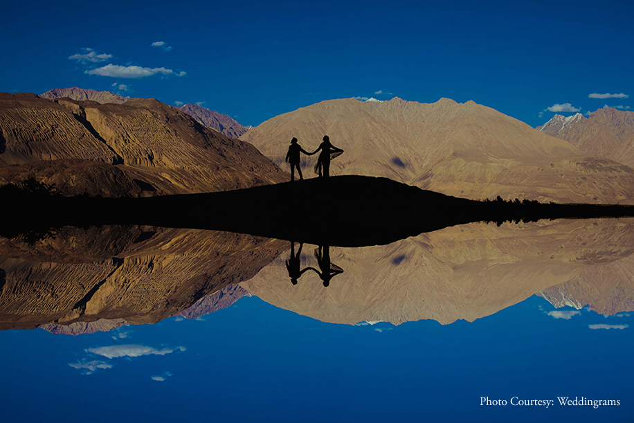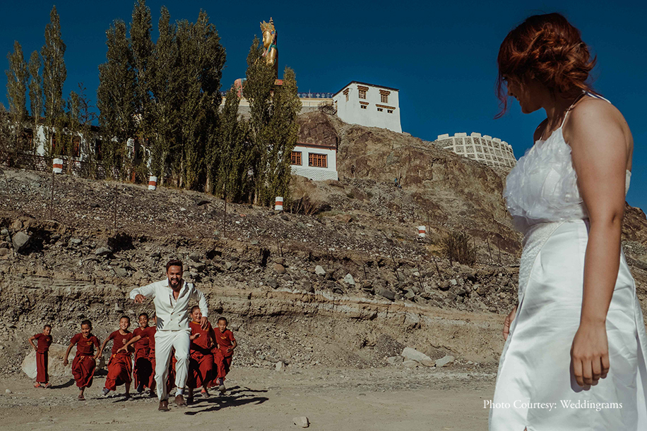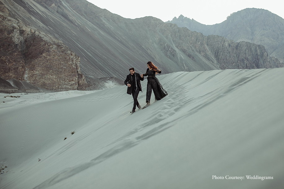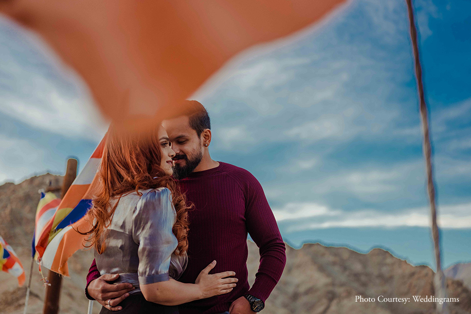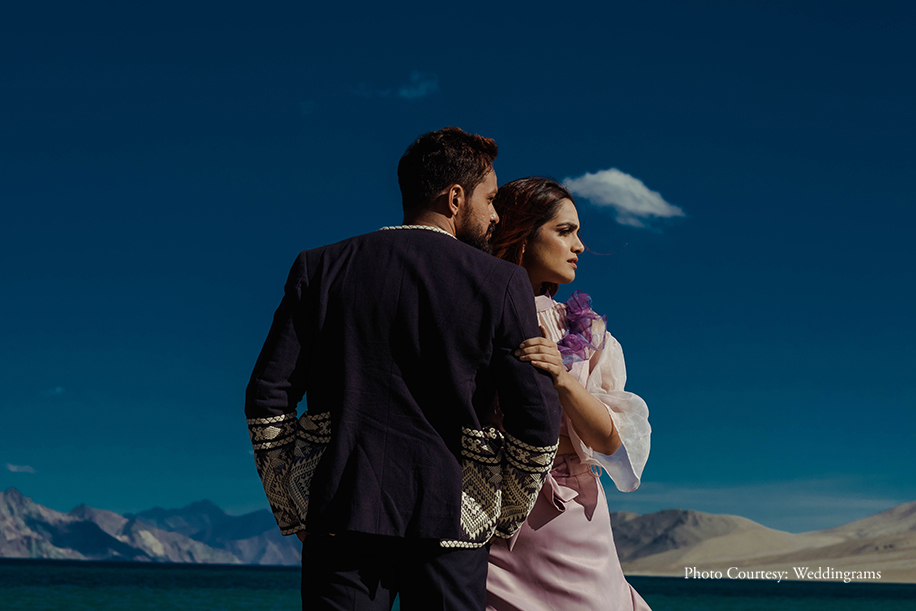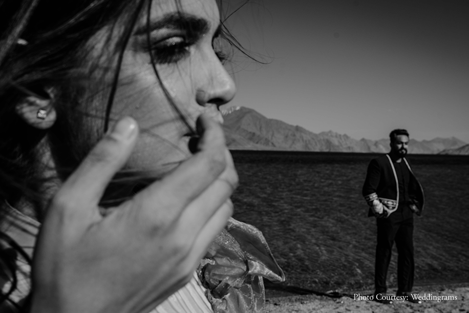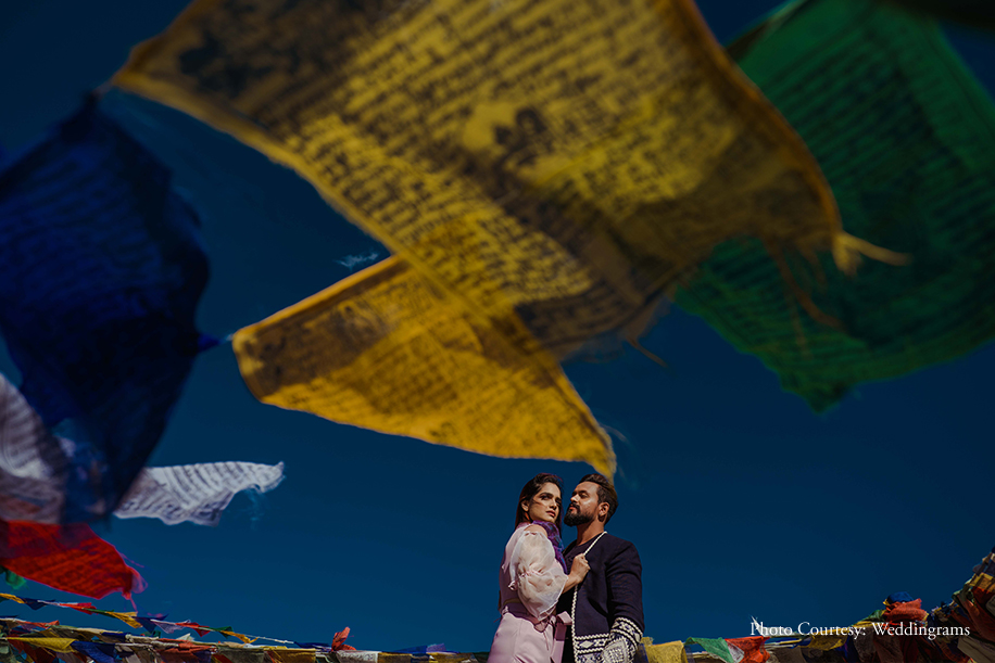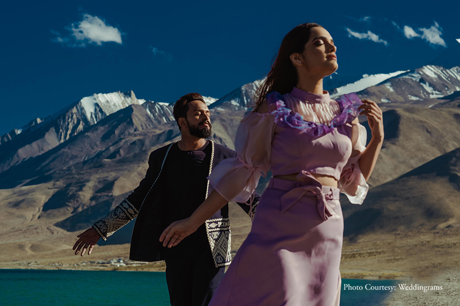 Tanvi says, “Anmol is a photographer so everything, from conceptualization to location and the shoot itself, was planned by him. After much consideration, we narrowed our location choices down to Ladakh or Goa. Ladakh’s raw beauty and fascinating local culture finally won us over. Needless to say, it is the best place we could have chosen. The shoot was done by Weddingrams, which is owned by one of Anmol’s closest friends. Taking it to the next level was Anmol’s little sister, Simran, our in-house designer, who created our outfits.”
