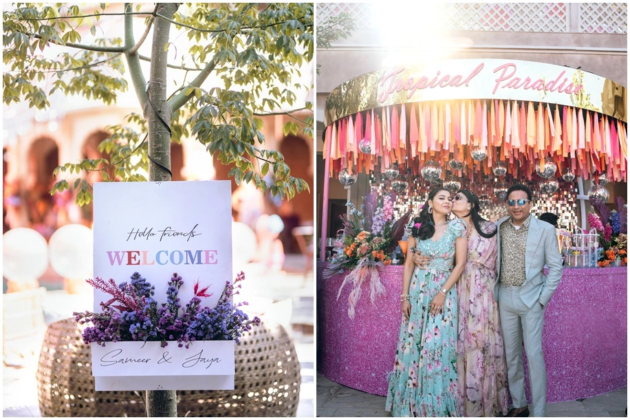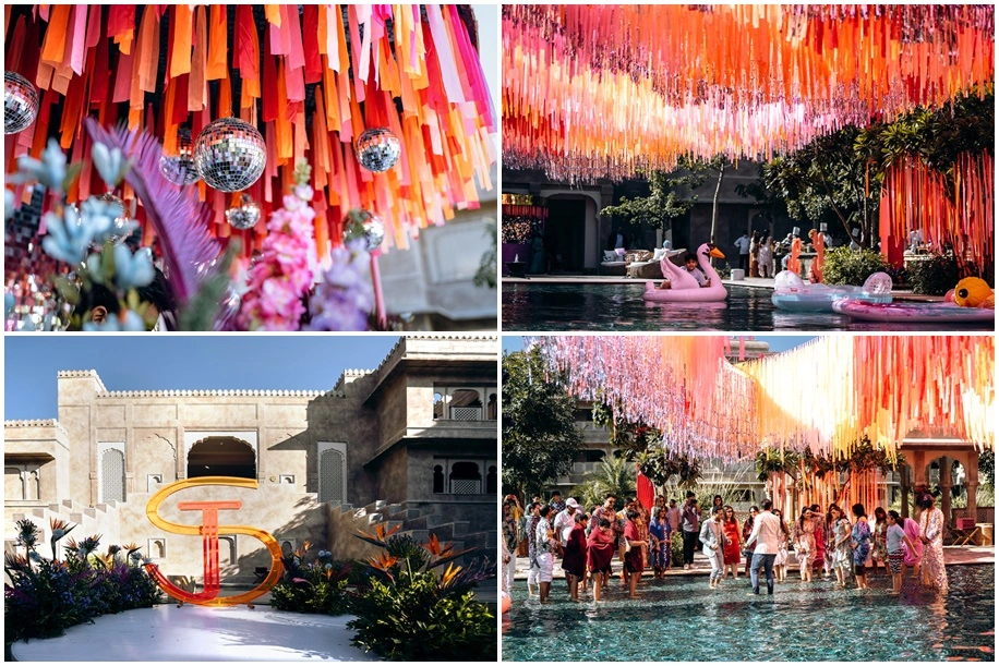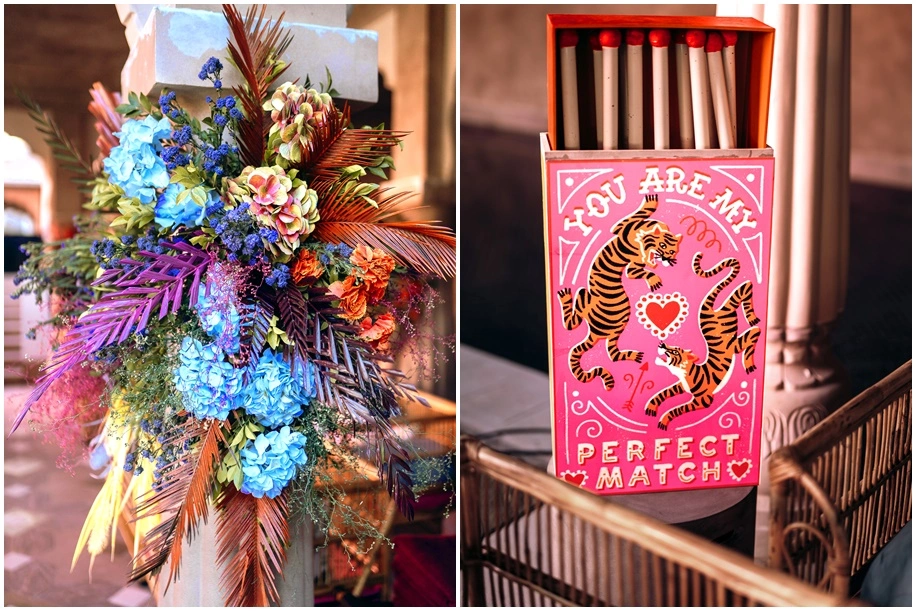 Design HQ brought some Hawaiian fun to the royal setting of the fort. The vibrant decor of bright hues and eclectic elements lit up the muted palette of the backdrop and infused energy into the pool-side revelries. Bright florals, fun prints, boho cane furniture and fabric tassels all came together to create a lively ambience. Large-than-life cacti added an interesting touch to the occasion, while tiger-printed upholstery acknowledged the history of Ranthambore.