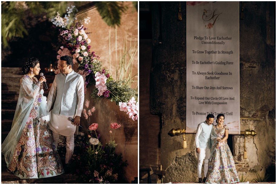 The Vow renewal was a whimsical celebration of love at the iconic courtyard of Fort Barwara. The couple descended the staircase decorated with dreamy floral arrangements amidst an ethereal show of fireworks. Standing in front of a gigantic scroll that hung down the side of the fort and carried their vows, they renewed their promise of commitment and togetherness in front of their loved ones, followed by a divine ceremony of Ganga Aarti.