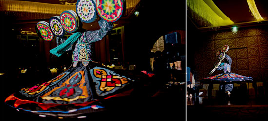 The Walima was held at The Symphony Ballroom at the Address hotel in downtown Dubai. Says US based Mili Ghosh who photographed all the wedding functions: “Tarnim looked stunning in her bright red Manish Malhotra anarkali and her classic look took me back to the 50s bollywood.” A Tanoora dancer and the ‘drums of the world’ group entertained guests throughout the Walima evening. The long swirling colorful skirts that the Tanoura performer wore made spectacular patterns as he twirled around in circles. ‘Drums of the World’ percussion ensemble is a uniquely dynamic musical collective, it takes the form of a facilitated jazz/fusion ensemble using duns duns, djembes, tablas, doumbeks, clay pots, mouth harp, shekeres, bongos, and other world percussion instruments, that provide exciting vibes.