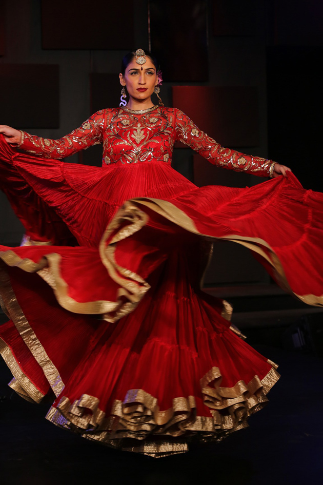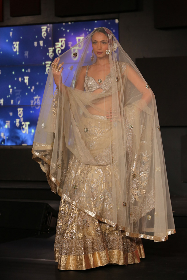 Taking inspiration from poetry penned by his mother (Indira Varma), Suneet’s collection had a nostalgic and tender touch to it; long beige and ivory anarkalis worn with farshi shararas and light wispy chiffon dupattas. The show also highlighted nine meter saris worn in Awadh style with tonal embroidery, velvet blouses with sheer sleeves and mukaish embroidery. With voice overs by Farookh Sheikh, singer Radhika Chopra and poets Indira Varma and Zehra Nigah the show was a visual and soulful treat for the audience.