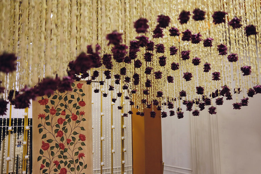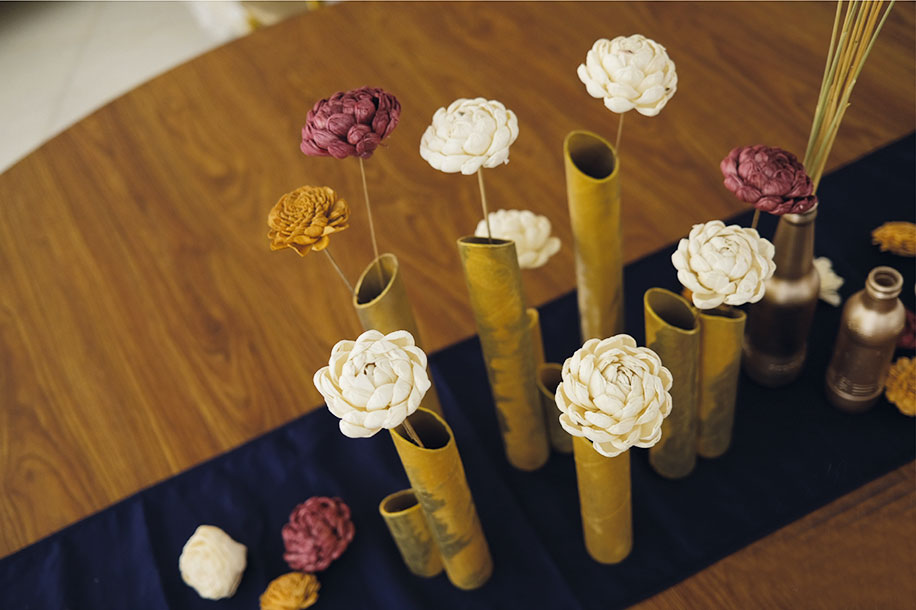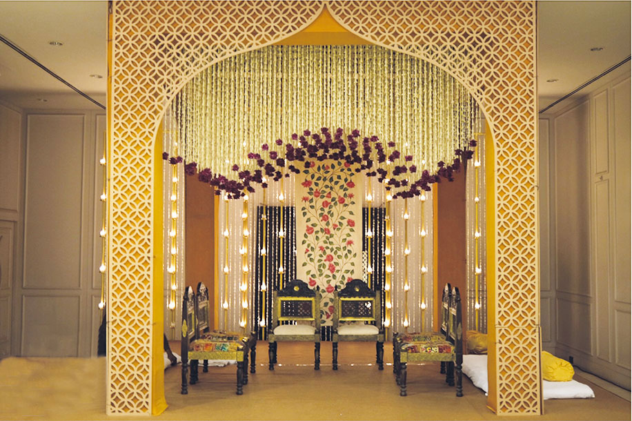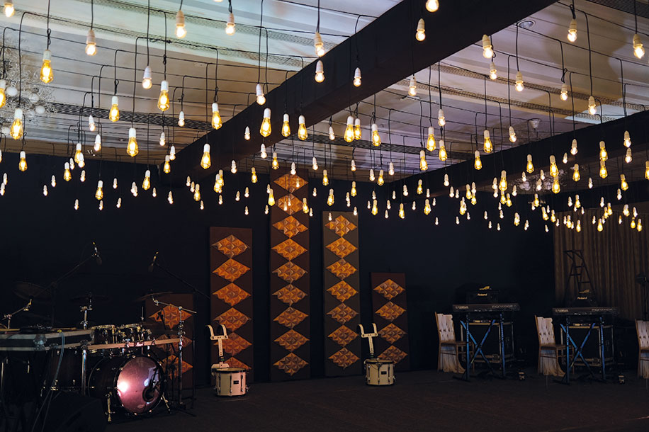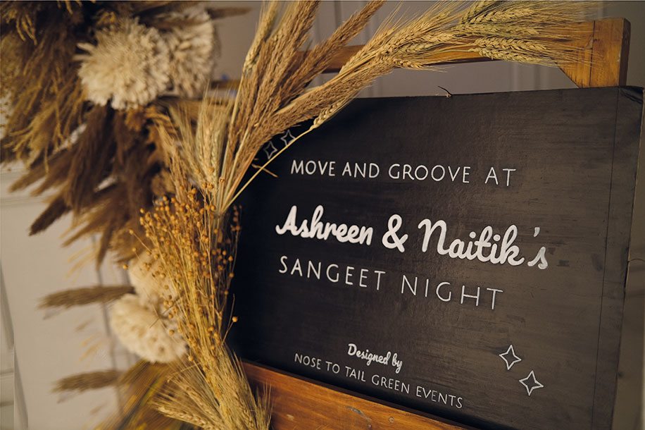 Designed to be drastically different from the mehndi function in terms of decor and energy. the sangeet was modern and edgy with a dash of bling. A deep navy hue made up the background, in order to emphasize and highlight the handmade upcycled origami statement panels. Hundreds of sheets of scrap paper were painstakingly converted into a shiny golden wall of origami and made for an unforgettable addition. A canopy of suspended tungsten bulbs hung over the stage where the couple and their loved ones put up stunning performances. Upcycled cardboard tubes, shola flowers and dried leaves completed the modern, classy look.
