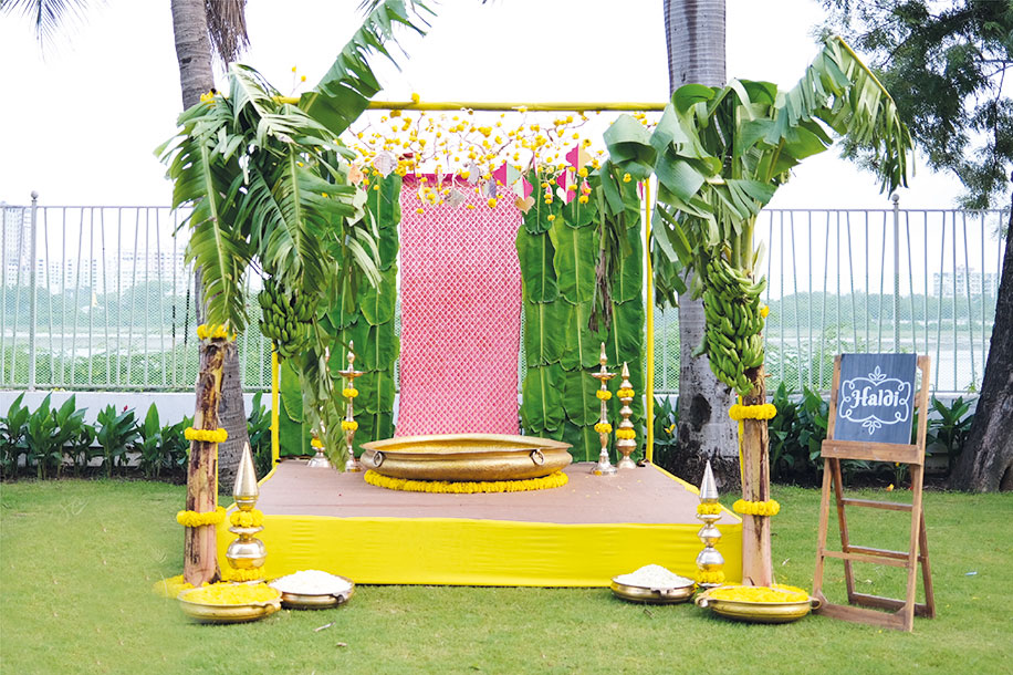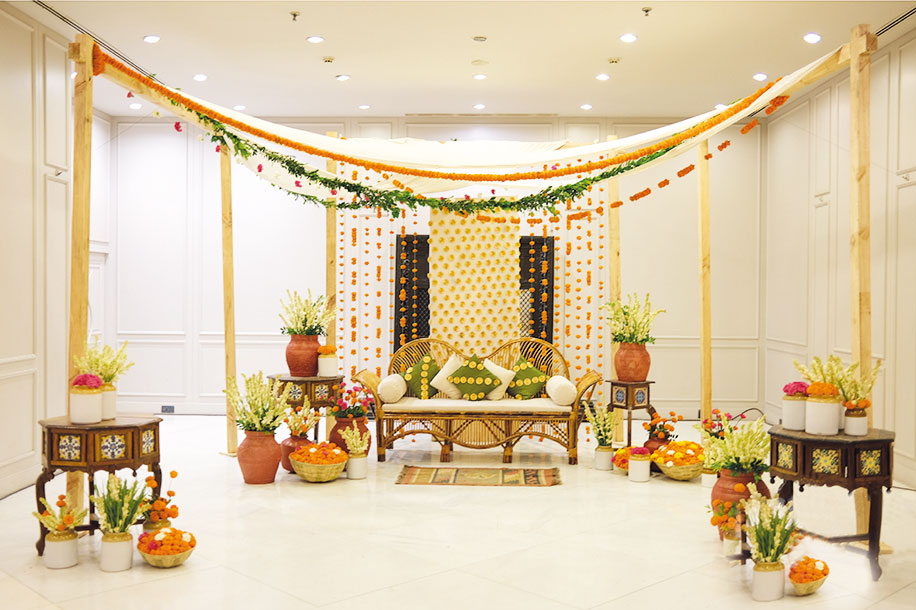 The next day began with a vibrant, sunny Haldi and Chooda ceremony. The bride’s Punjabi roots and love for traditional South Indian decor inspired the unique ‘North meets South’ decor style. A beautiful handmade Phulkari dupatta offset by fresh green banana leaves made for the perfect backdrop while bright yellow marigolds and upcycled cardboard motifs suspended from the ceiling tied the whole look together.