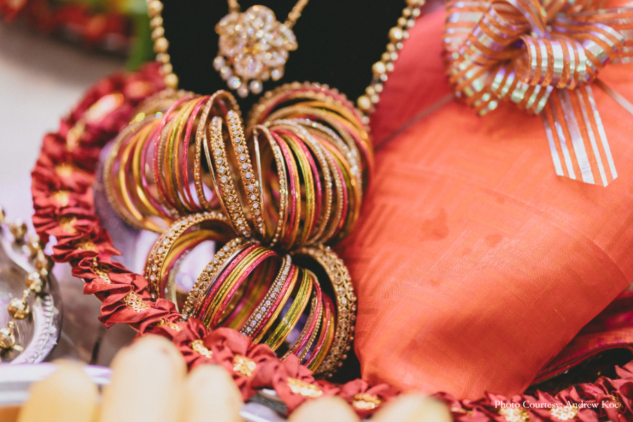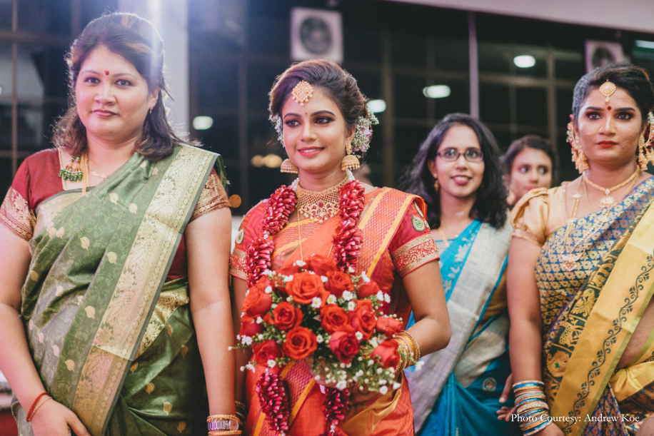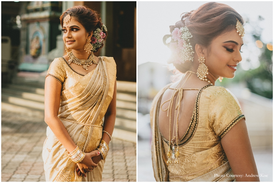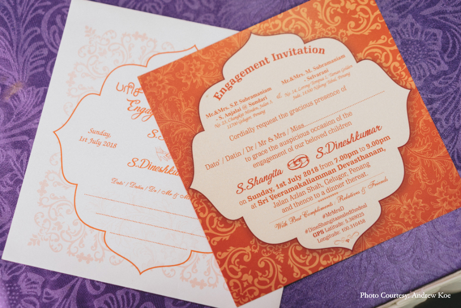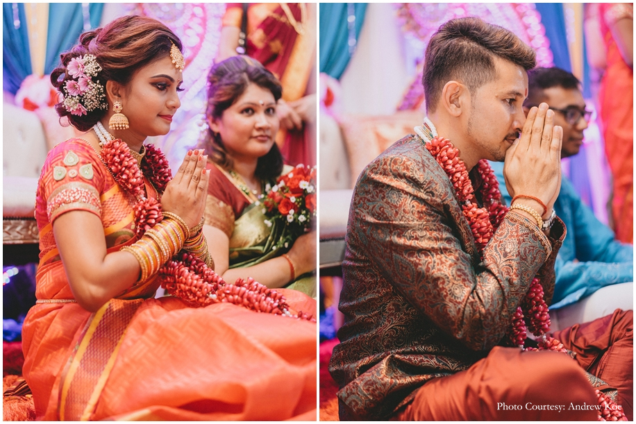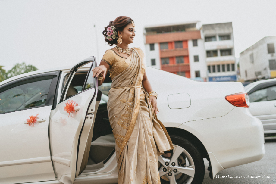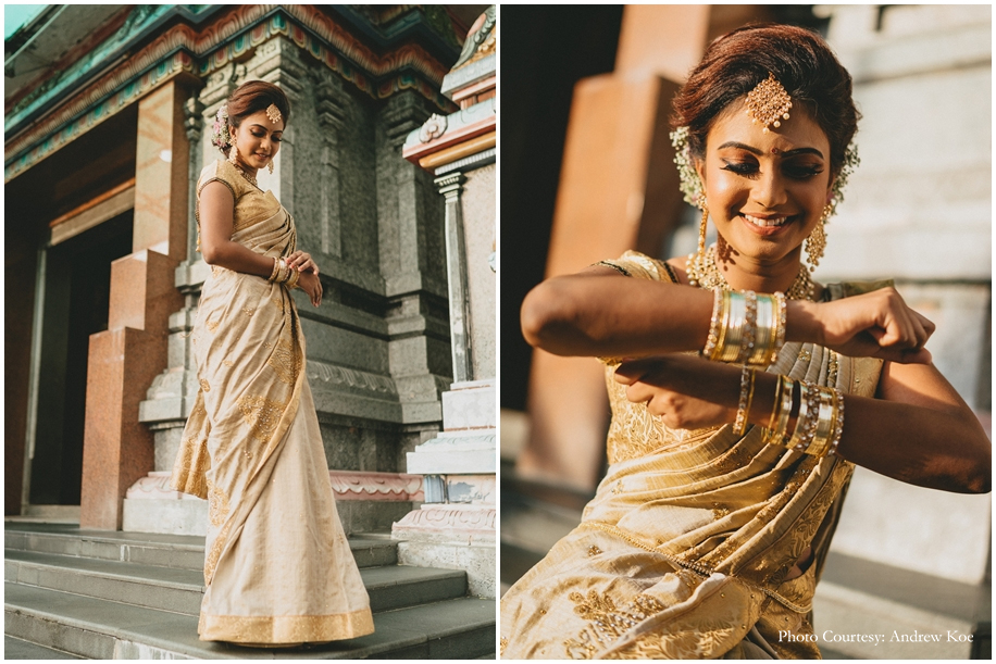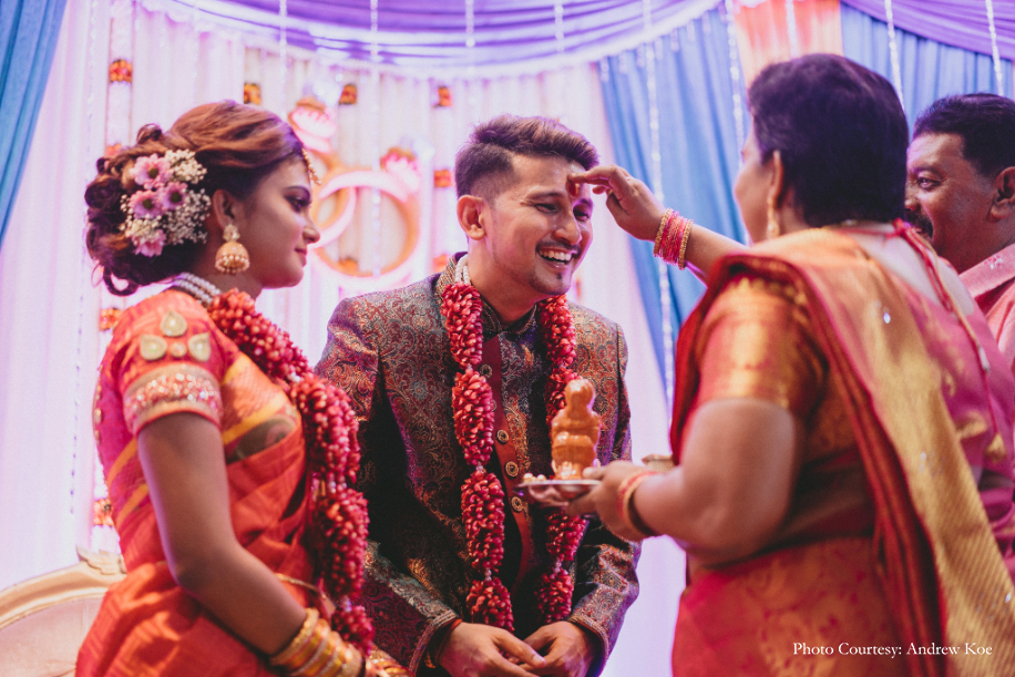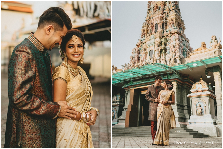 Dinesh and Shangita followed South Indian rituals at their engagement in the Sri Veeramakaliamman Temple, one of Penang’s oldest. With its colorful statues and intricate detailing, the temple made for a stunning backdrop for the bride who posed pretty for the cameras before the ceremony. She wore an intricate silk saree with a matching blouse covered in stonework and embroidery. She complemented the beautiful saree with statement jewelry. The groom wore a traditional Bandhgala that resonated with his ladylove’s ensemble. Absolutely dashing!