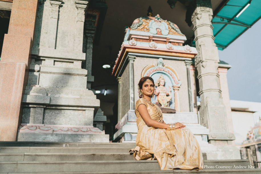 Dinesh and Shangita followed South Indian rituals at their engagement in the Sri Veeramakaliamman Temple, one of Malaysia’s oldest. With its colorful statues and intricate detailing, the temple made for a stunning backdrop for the bride who posed pretty for the cameras before the ceremony. She wore an intricate silk saree with a matching blouse covered in stonework and embroidery. She complimented the beautiful saree with statement jewelry. The groom wore a traditional Bandhgala that resonated with his ladylove’s ensemble. Absolutely dashing!