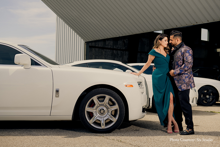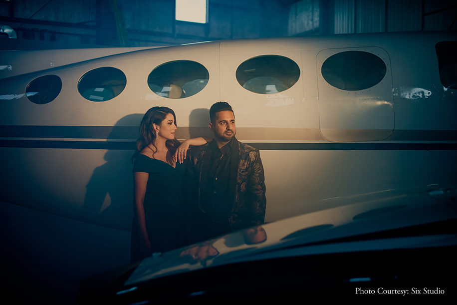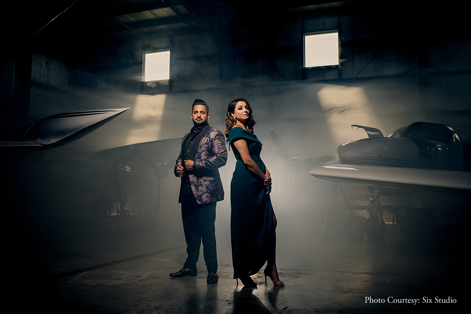 The photoshoot for this couple was filled with grace and panache. They posed against the backdrop of vintage cars and private jets while their stunning outfits complimented each other. Akanksha looked regal in an elegant green gown with a low-neckline for the shoot, while Karan donned a dapper black & white tux with a floral printed suit. A romantic mood was set by the voice of Manj Musik in the background as the couple grooved to the tunes.