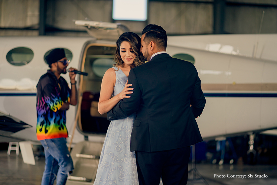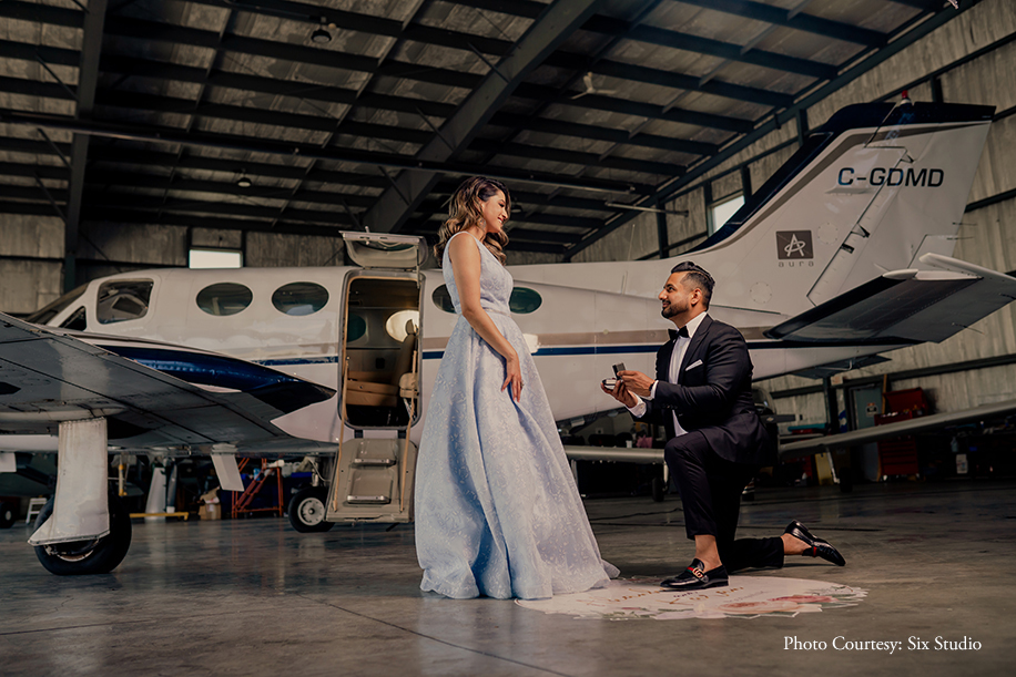 While Akanksha glammed up for the photoshoot, Karan waited for her with a breathtaking surprise at the venue. As she walked in, Karan emerged out of a private jet and got down on one knee to propose to her. The proposal resembled a romantic Bollywood film complete with a live musical performance by Manj Musik singing romantic songs in the background.