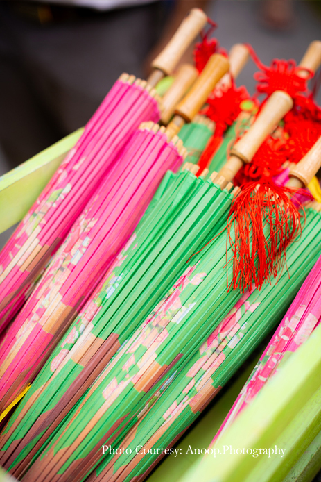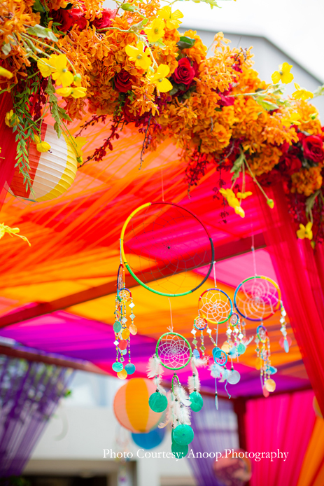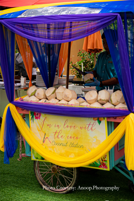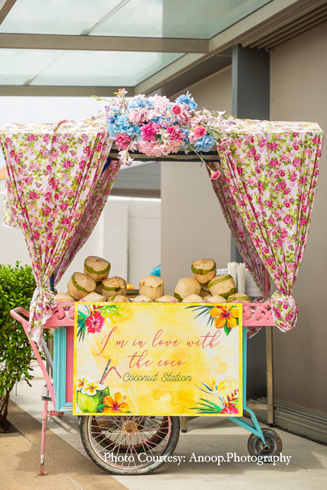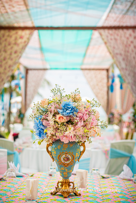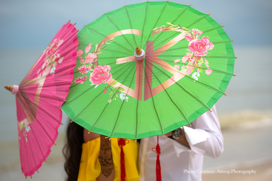The evening Mehndi function was held outdoors with the gorgeous azure sea providing a breathtaking backdrop. The party included an elegant British-style ‘high tea’, with beautiful floral vases, quirky and colorful tires and floral umbrellas providing a vibrant, upbeat ambience.