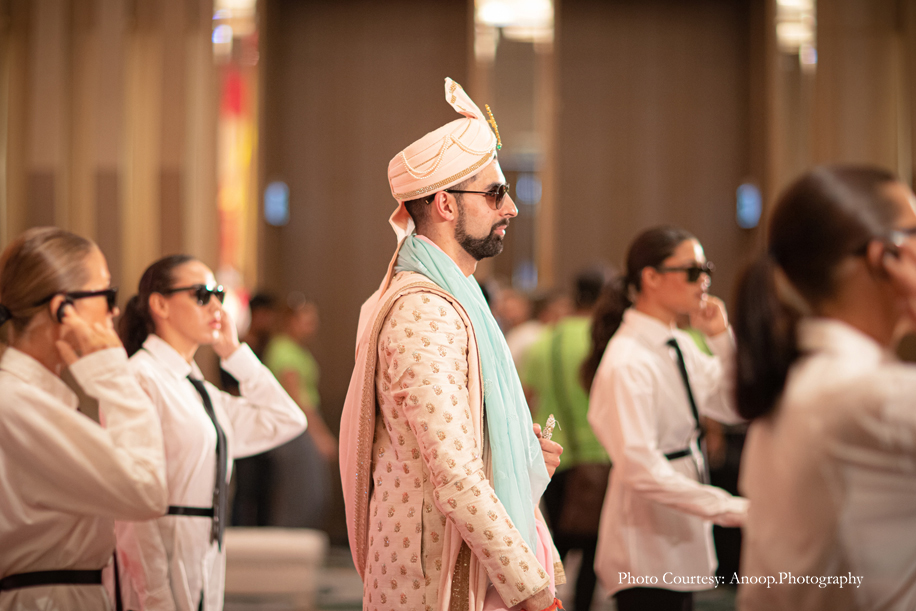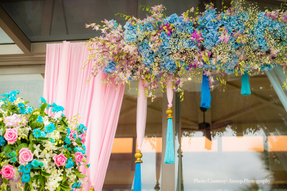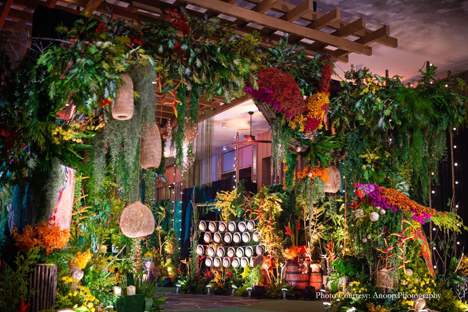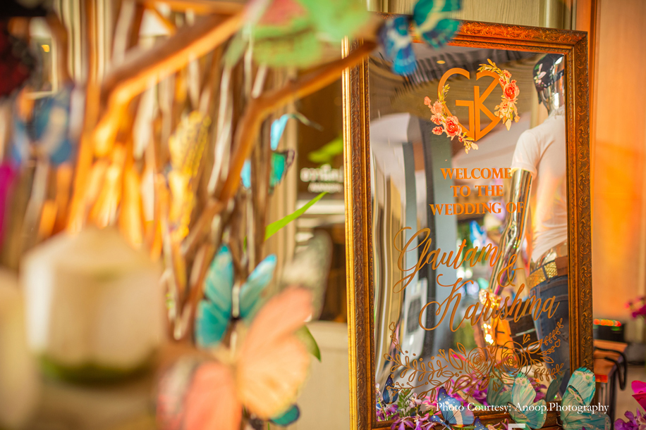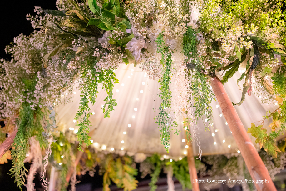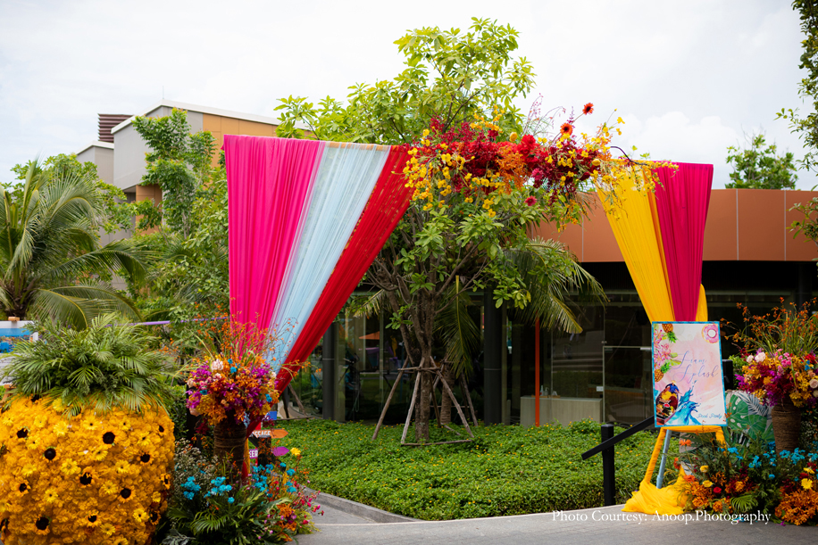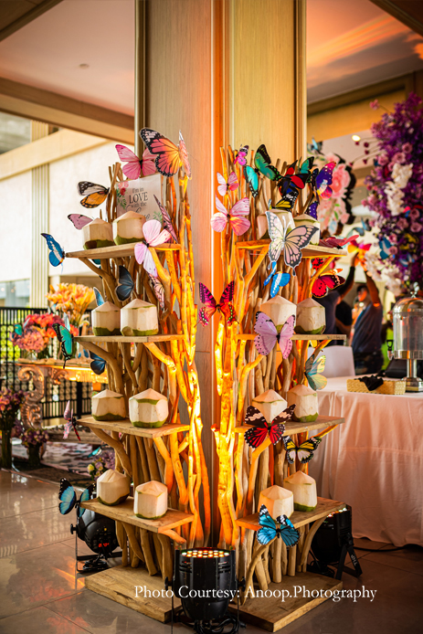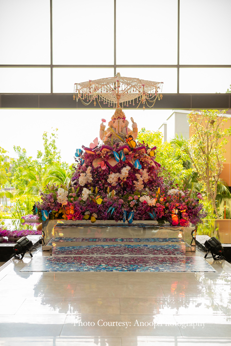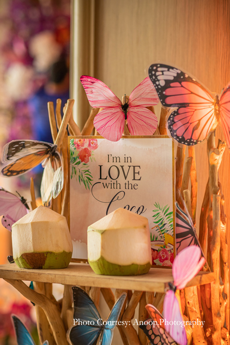 Bamboo dancers welcomed the guests to the resort, where the gorgeous floral decor at the reception, pond and fountain enthralled them. There were also 3D butterflies and a structure of Lord Ganesh erected for an auspicious start to the celebrations. The festivities kicked off with a serene Behrano ceremony, which involves saying a prayer to invoke the blessings of Jhulelal Sai. It was attended by just the families and a few close friends of the couple.