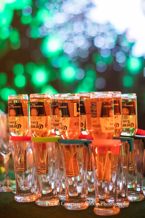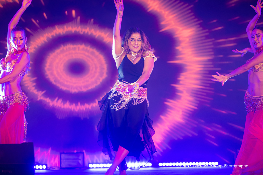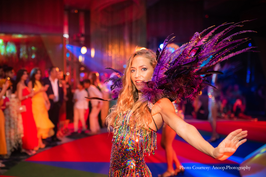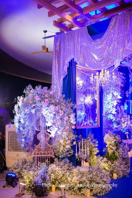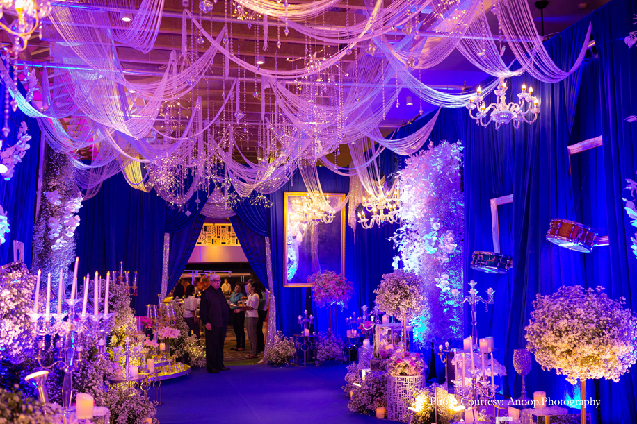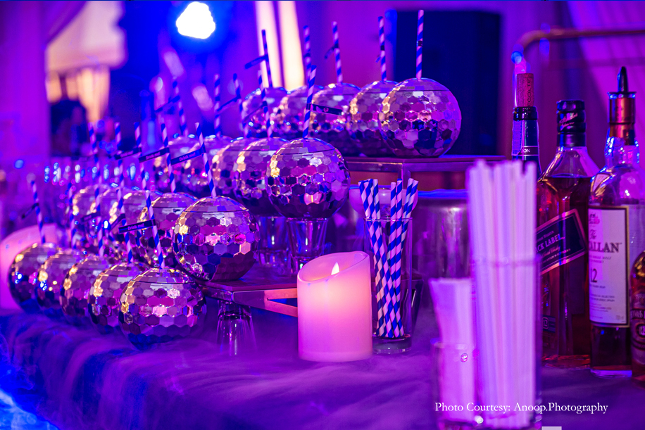 The evening sangeet and reception was in the form of an elegant cocktail party with a ‘Starry Night’ theme consisting of midnight blue, white and silver decor, punctuated with a plethora of candles and chandeliers. Amidst an evening that was filled with champagne and laughter, entertainment included a performer dancing inside a large martini glass! The bride and groom made a grand entrance, seated on a throne as the song ‘Mera Wala Dance’ played.