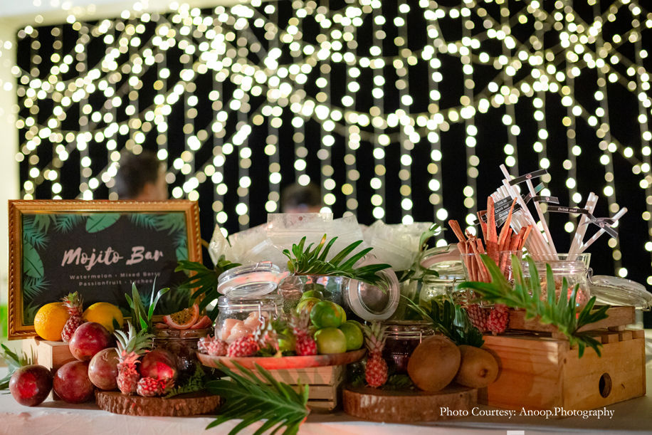 The celebrations wound down with a farewell BBQ dinner hosted on the lawns. Guests got to enjoy a show of pictures and videos from the functions that took place on the previous days. The ambience at the outdoor party was romantic and elegant, using elements in white and fairy lights to decorate the area.