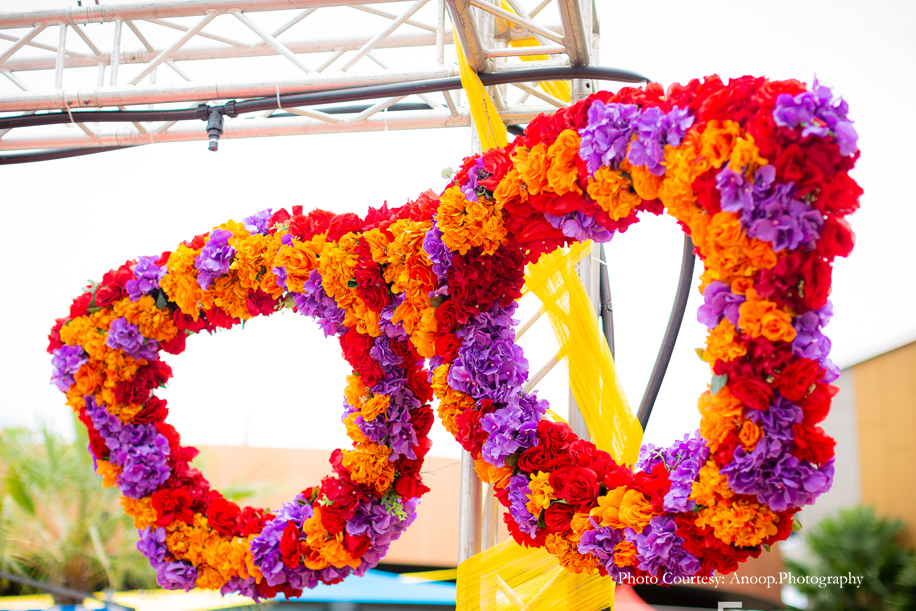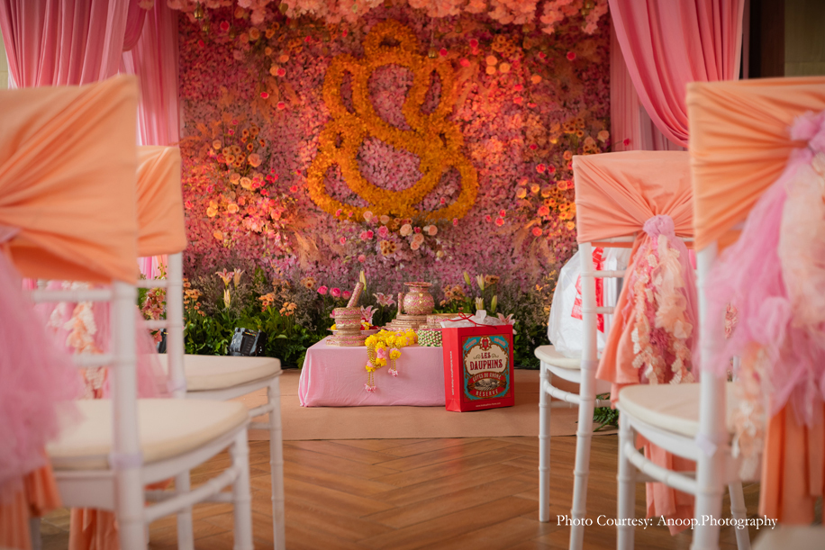Day one began with the sacred and traditional thread ceremony for the groom, followed by Ghari Pooja for the couple. This was done in two separate prayer halls, which were individually set up for the two families. Both halls were decorated in floral themes – the bride’s consisted of pink and orange flowers and the groom’s had white and blue flowers with a touch of red.