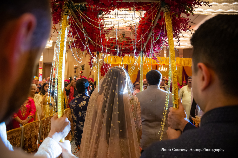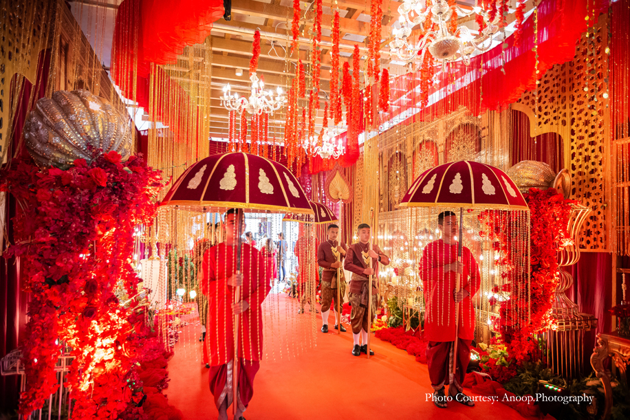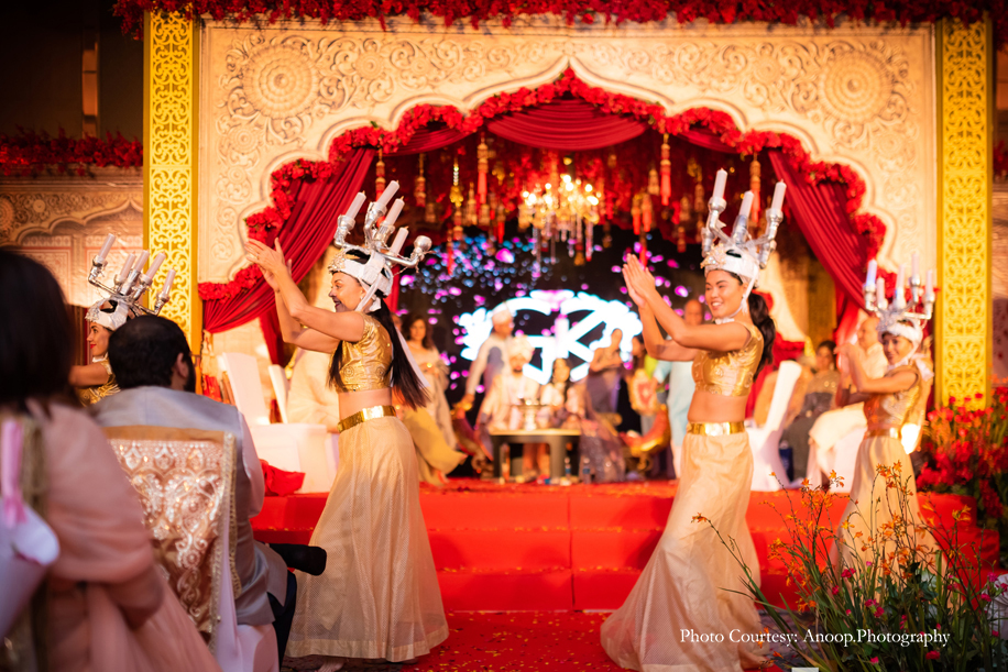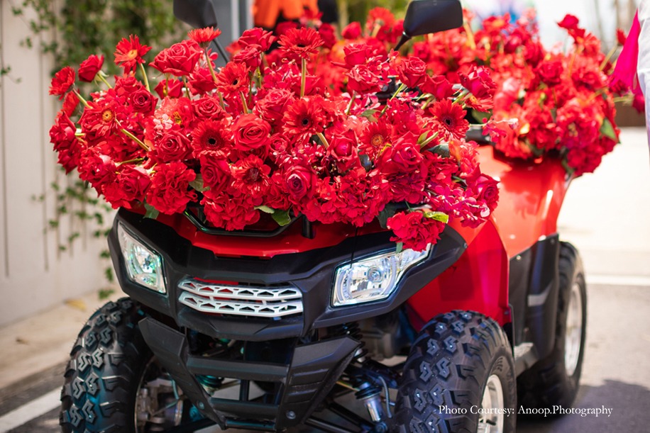 The theme for the pheras was ‘Rajasthani Romance’. The decor was a surreal explosion of red and gold! The groom made an unusual entry on an ATV and then danced his way to the mandap, escorted by gorgeous female ‘bodyguards’! The crowd went wild and cheered him on. What followed was a regal procession for the bride, with men holding umbrellas, torches and fans. Her entry was truly royal and befitting of a princess. Karishma entered the venue with her four brothers, waving and high-fiving friends as she walked down the aisle. The pheras concluded with a group of dancers performing to the film song ‘Ghoomar’.