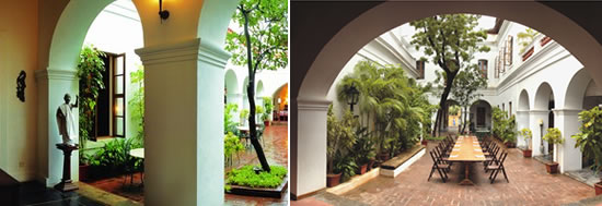 All the rooms are beautifully decorated with french colonial furniture including four poster beds and dark-wood wardrobes, fascinating artefacts, traditional tiles and woodwork. All rooms are elegantly attired in whites, pinks, yellows, or cool emerald They have a wonderful, airy feel and surround a pretty courtyard shaded by citrus and neem trees. Top favorites are Mahe ( a double bedded luxury suite) , Karikal (a Grand Room with terrace and veranda) and Arcot, which has a patio.
